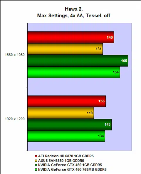 Despite the intensive settings, the cards managed well above 100fps, and here the Radeon HD 6870 suffered its only defeat against the 1GB GeForce GTX 460, as it was about 10% slower overall. The ASUS EAH6850 suffered the same fate too, losing out by around 12% to the 768MB GeForce GTX 460.