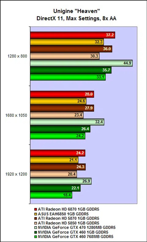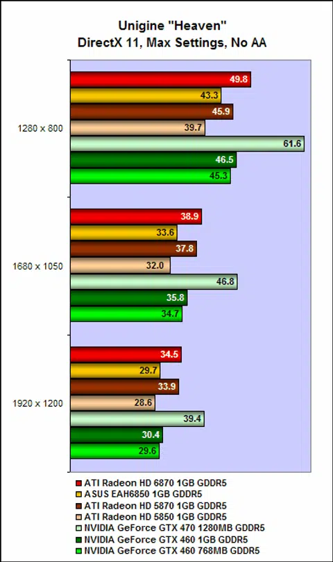 Unigine is a tessellation heavy benchmark and will be a good gauge of how effective the new tessellation unit in the Radeon HD 6870 and HD 6850 is. Running on DirectX 11 and with tessellation enabled, the new Radeon HD 6870 was easily able to outclass the 1GB GeForce GTX 460 and by a good 5% to 10% too. But perhaps what’s more impressive is that it was able to even outperform the powerful Radeon HD 5870.