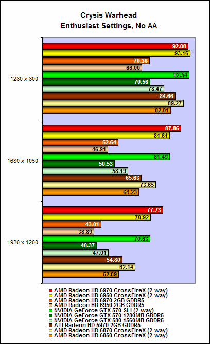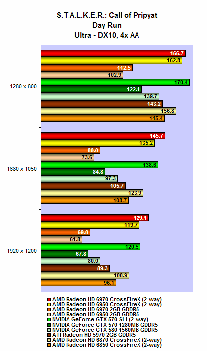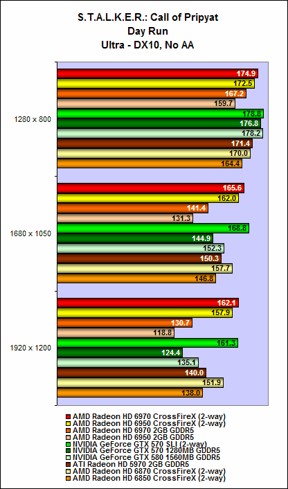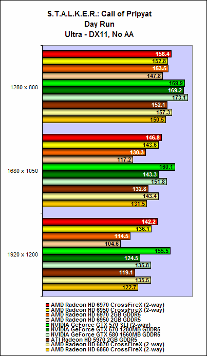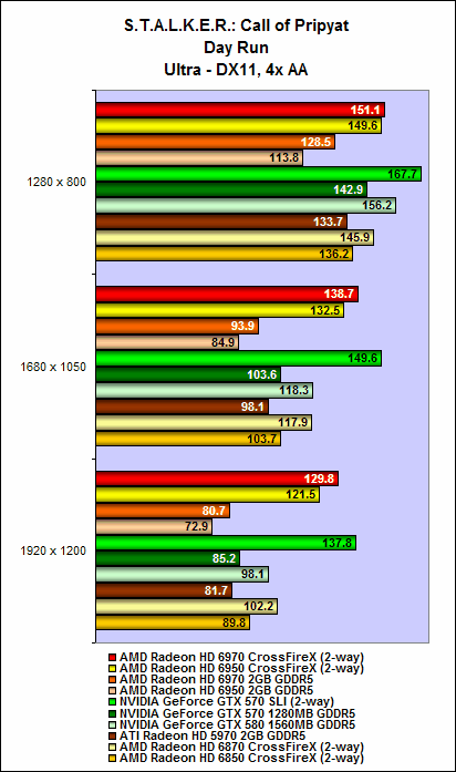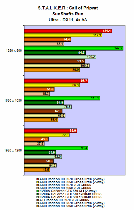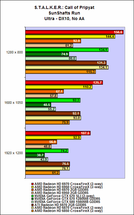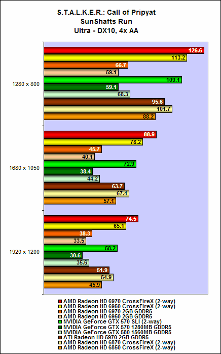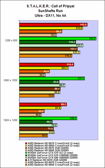 Nevertheless, both the Radeon HD 6970 and HD 6950 offered decent performance scaling. On intensive benchmarks such as Crysis Warhead and the Sunshaft runs for Stalker, we noted that adding an additional card to the mix can garner as much as a 80% to 90% increase in performance. On some benchmarks, the cards Radeon HD 6900 series in CrossFire can surpass the GTX 570 SLI configuration, but unfortunately this outcome wasn't consistent all through (but they were close at times).