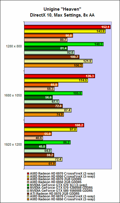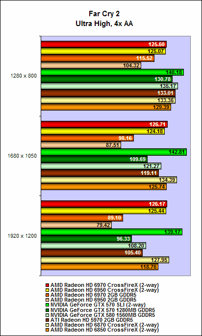 In our earlier review, we noted that a single GeForce GTX 570 was mostly quicker than the Radeon HD 6970, and it was mostly the same case here, with two GeForce GTX 570 cards offering mostly quicker performance than two Radeon HD 6970 cards. However, thanks to its massive combined framebuffer of 4GB, the Radeon HD 6970 was very capable when running on the highest resolutions and with anti-aliasing enabled.