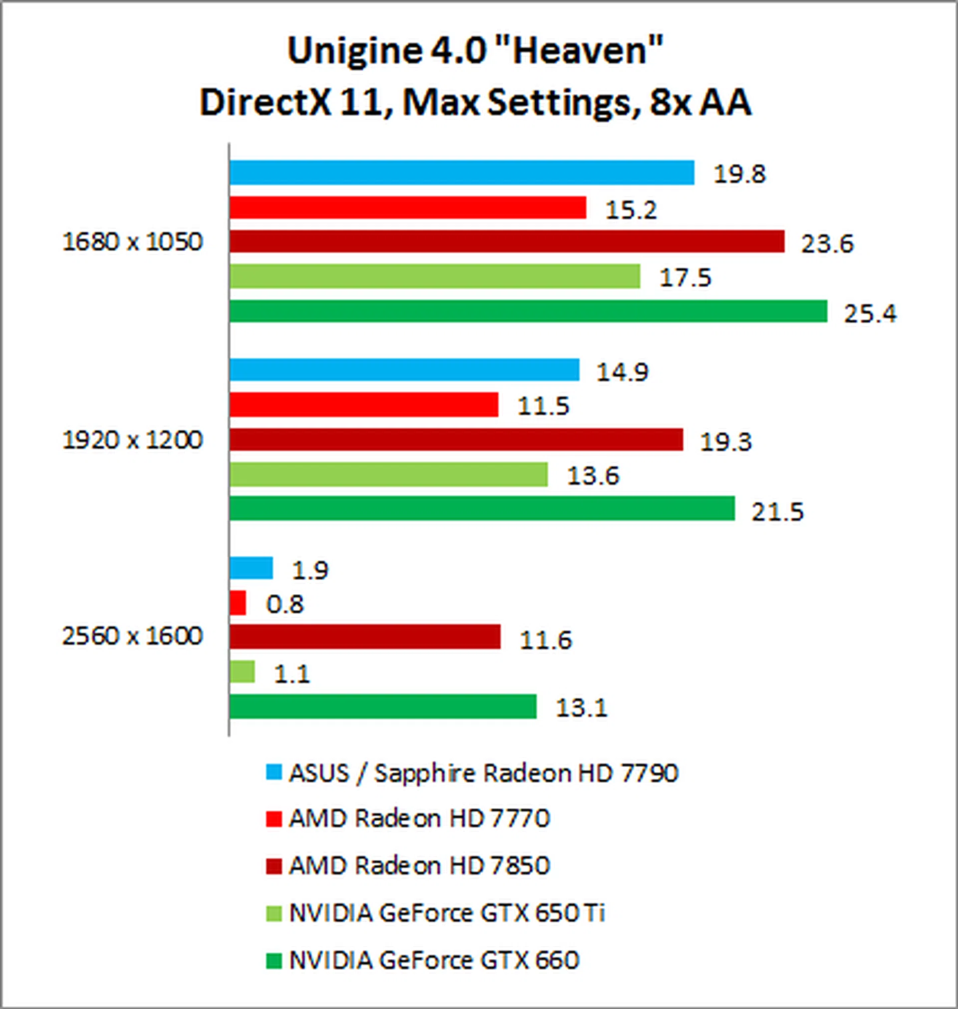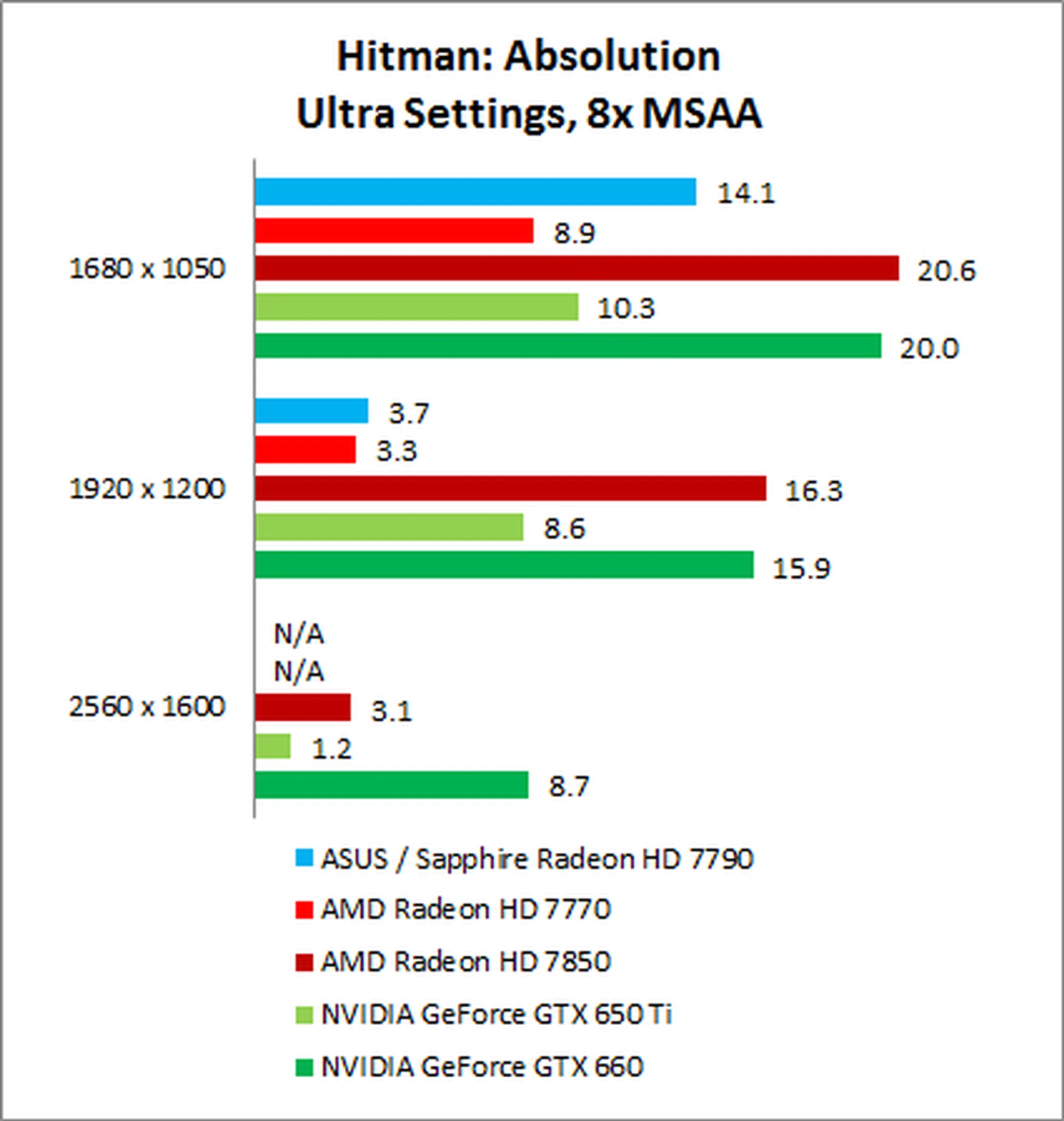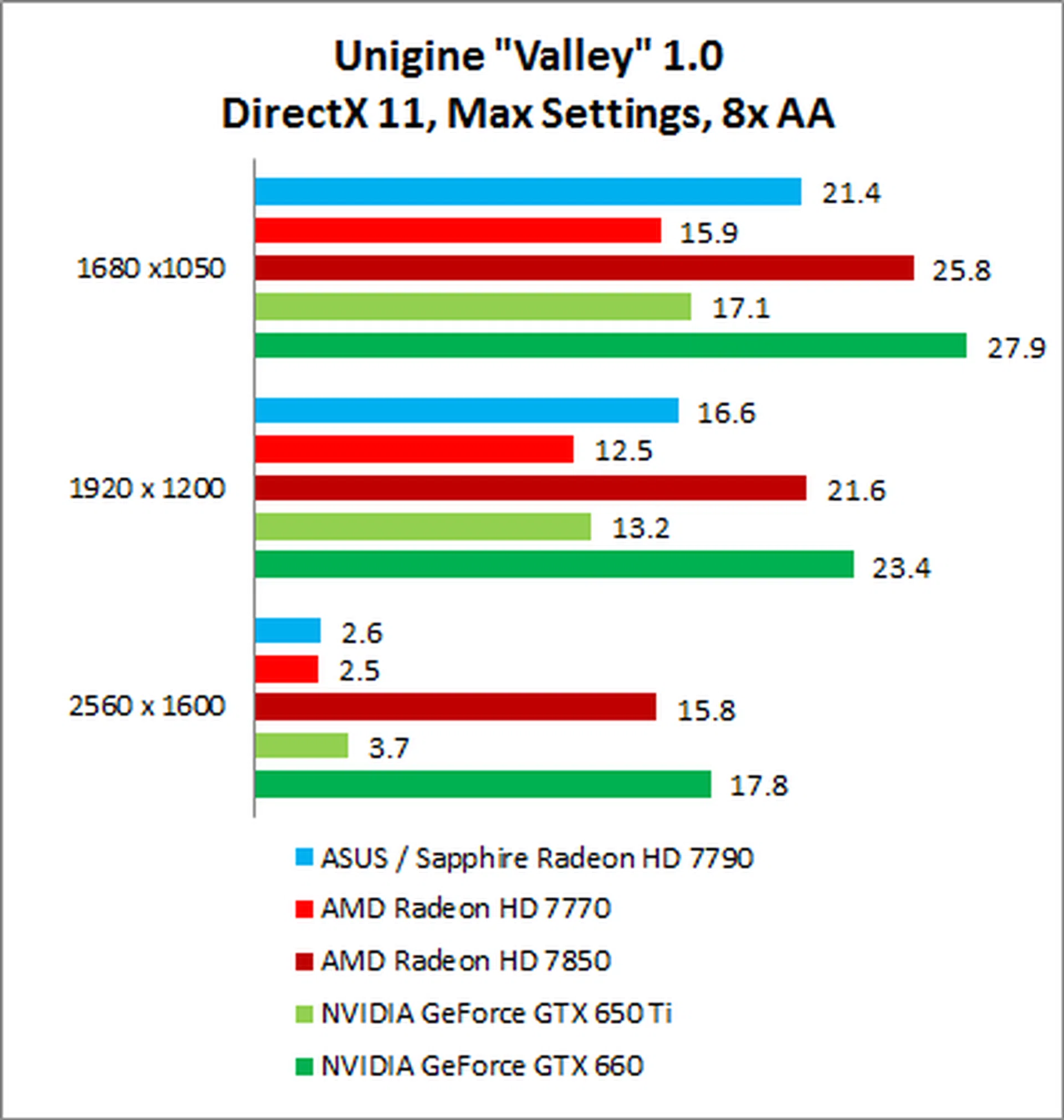 The HD 7790 wasn't as good here, again scoring about halfway between the HD 7770 and HD 7850. Again, we suspect that it just doesn't have the memory required to handle tougher benchmarks, especially at higher resolutions - as evidenced by it not being able to complete the 2560 x 1600 resolution benchmark at 8x MSAA.