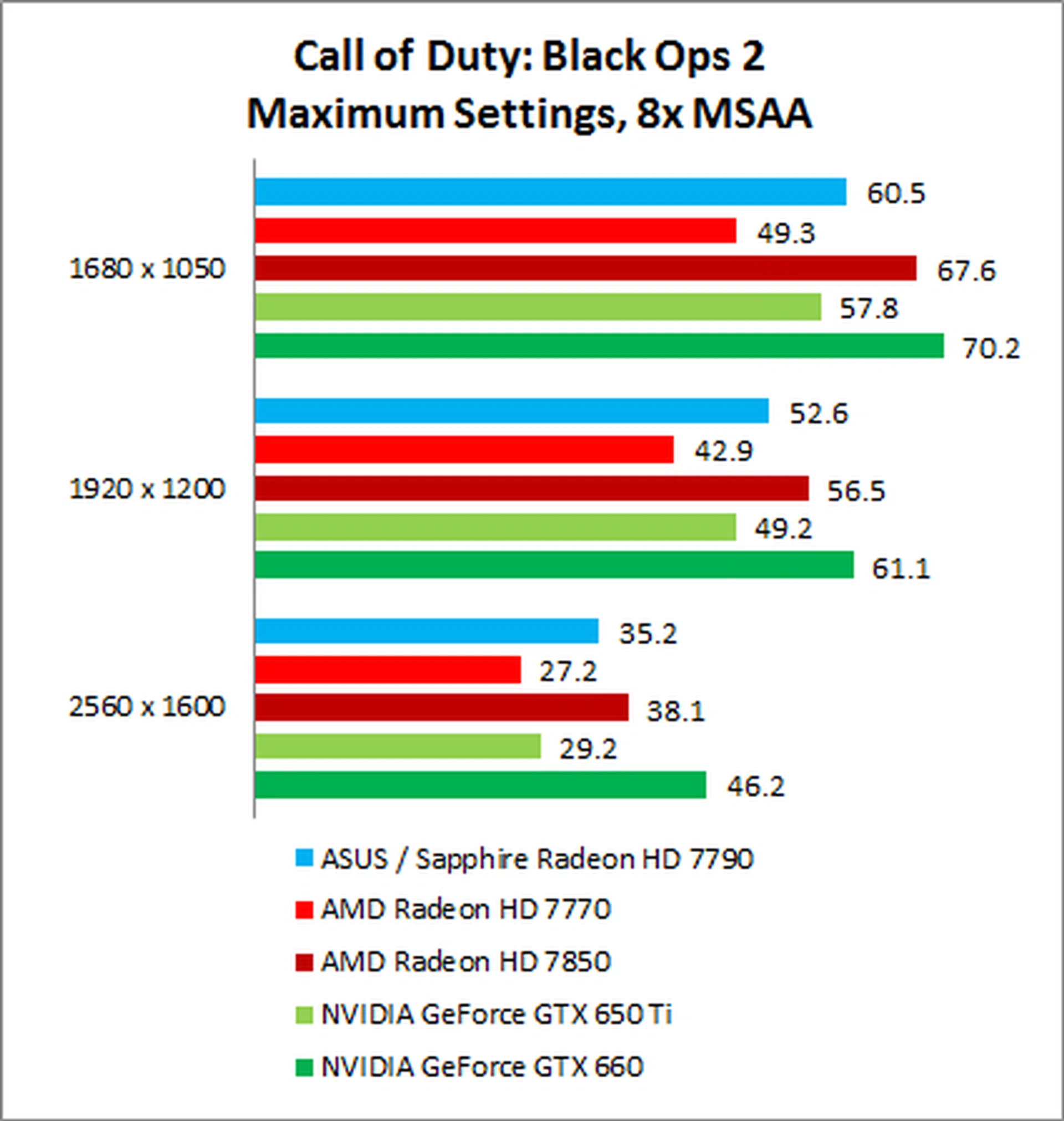 Black Ops 2 isn't that taxing and the HD 7790 performed fairly well as a result, trailing the HD 7850 by just a few FPS at the 1920 x 1200 and 2560 x 1600 resolutions. Surprisingly, it wasn't as good at the lowest 1680 x 1050 resolution, although it did still surpass the 60 FPS target.