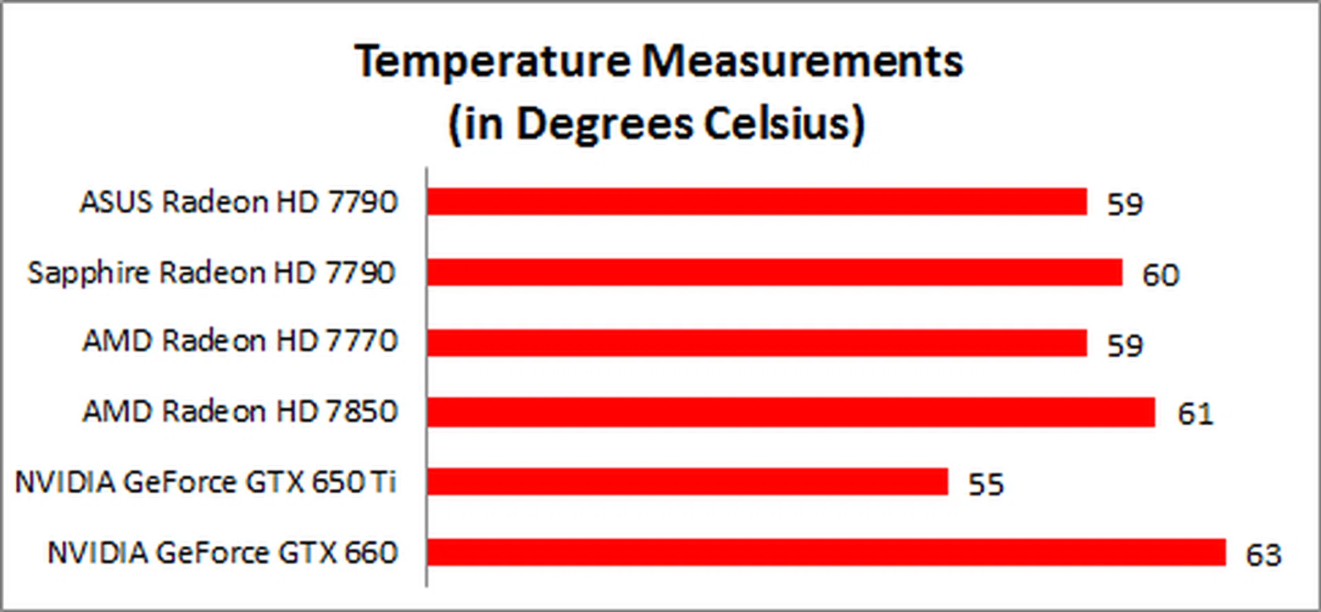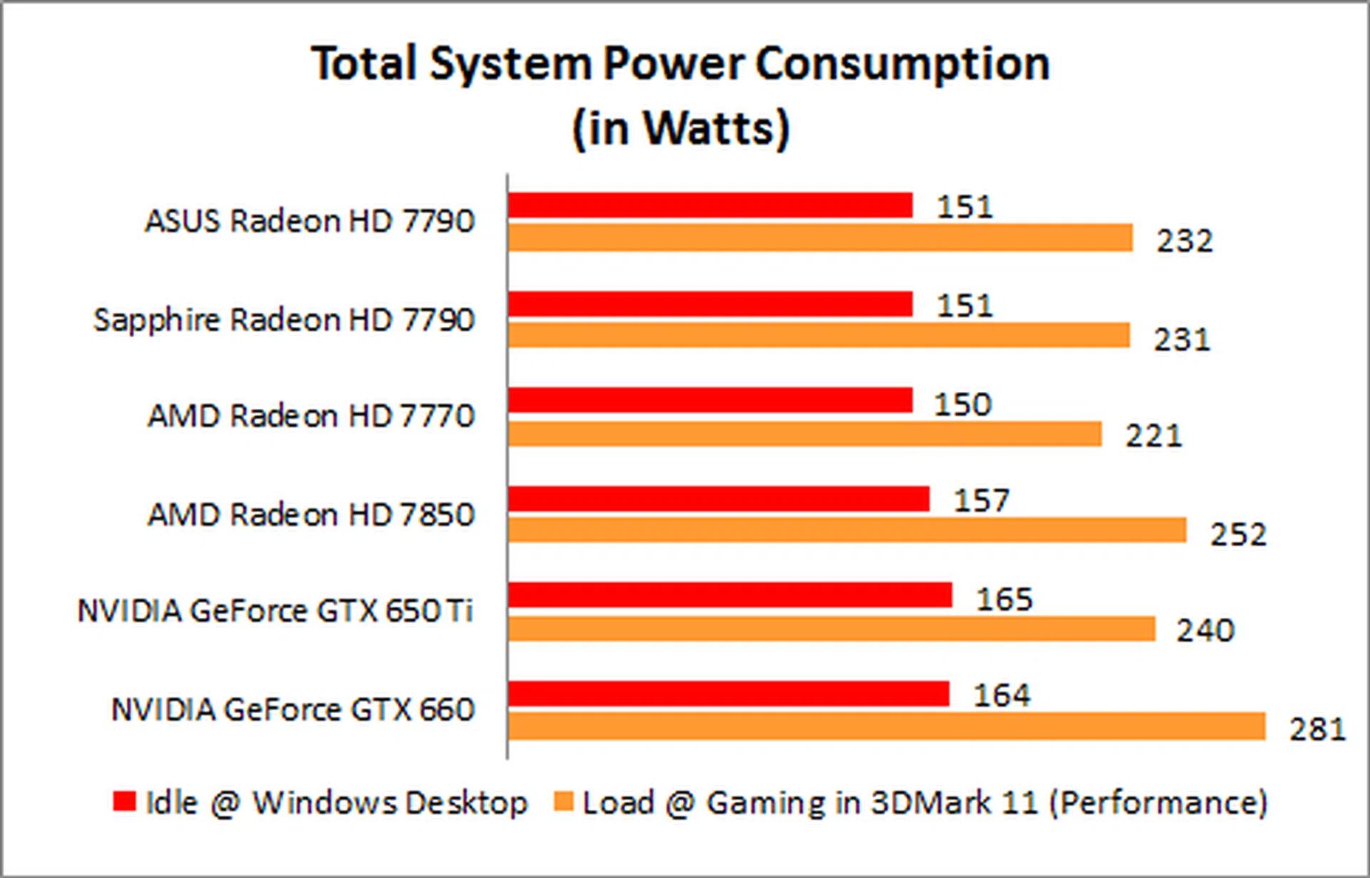 Power consumption was also nearly identical, with the ASUS card just 1 watt higher when performing at load. Again, there were no surprises here with the results well within our expected range, though a tad disappointing. With the improved number of DPM states supported on the Radeon HD 7790 GPU, we expected better power management, but it wasn't obvious at all.