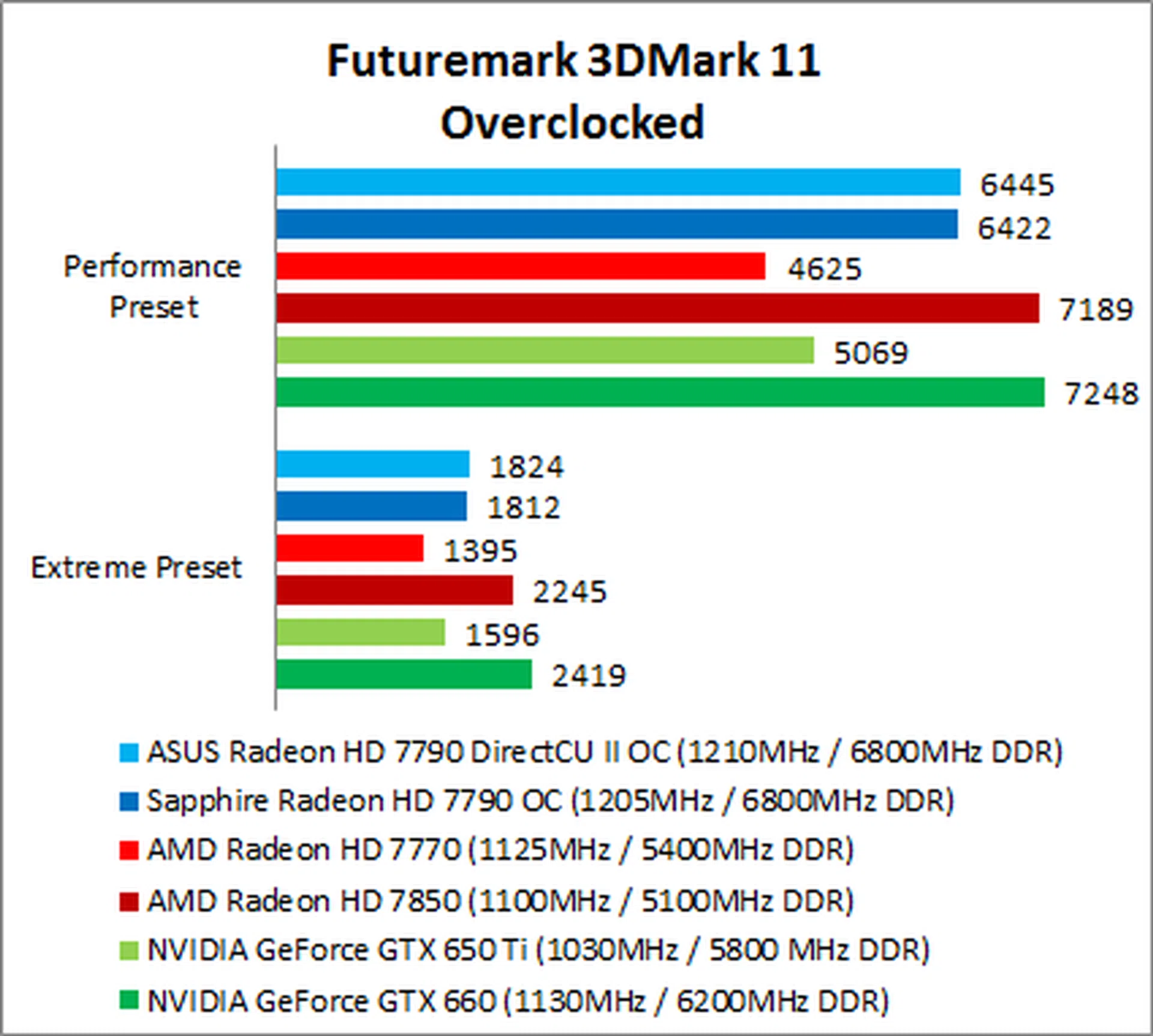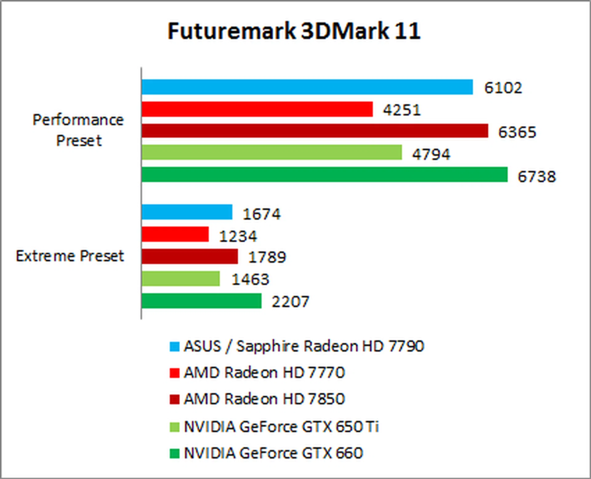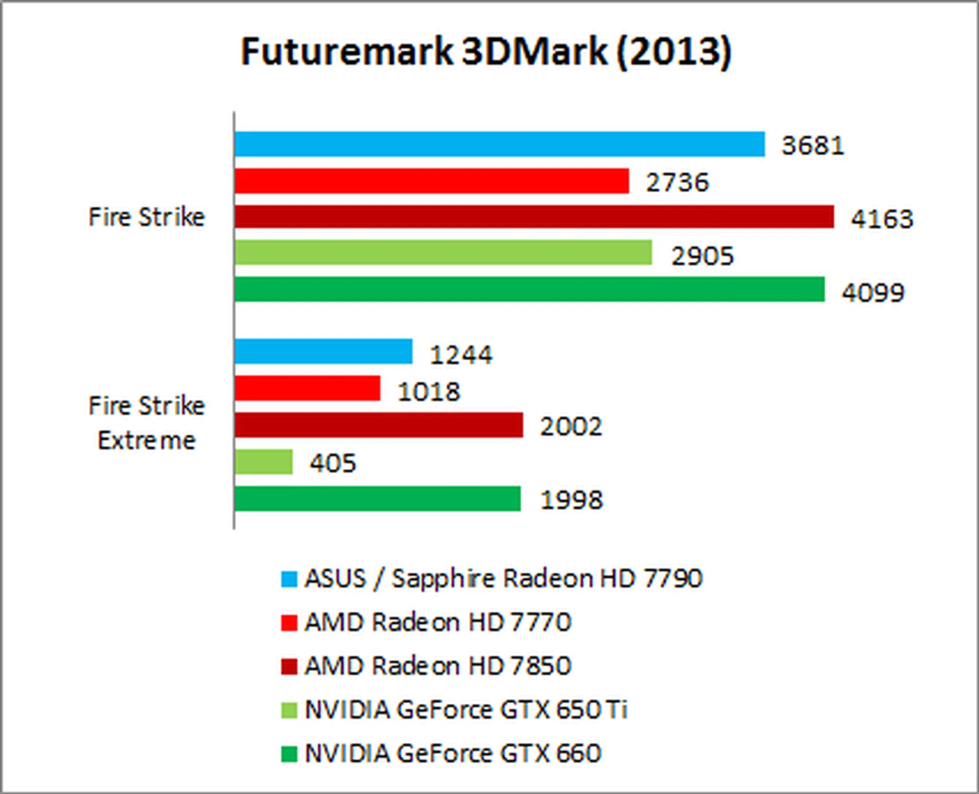 The HD 7790 struggled a little bit here, falling behind the HD 7850 by about 13% on Fire Strike, although it still outperformed the HD 7770 by 34%.
