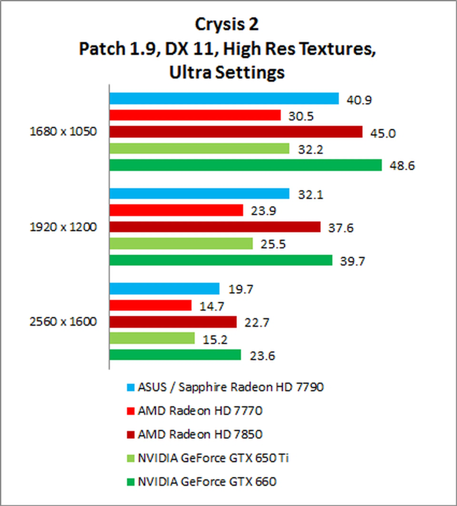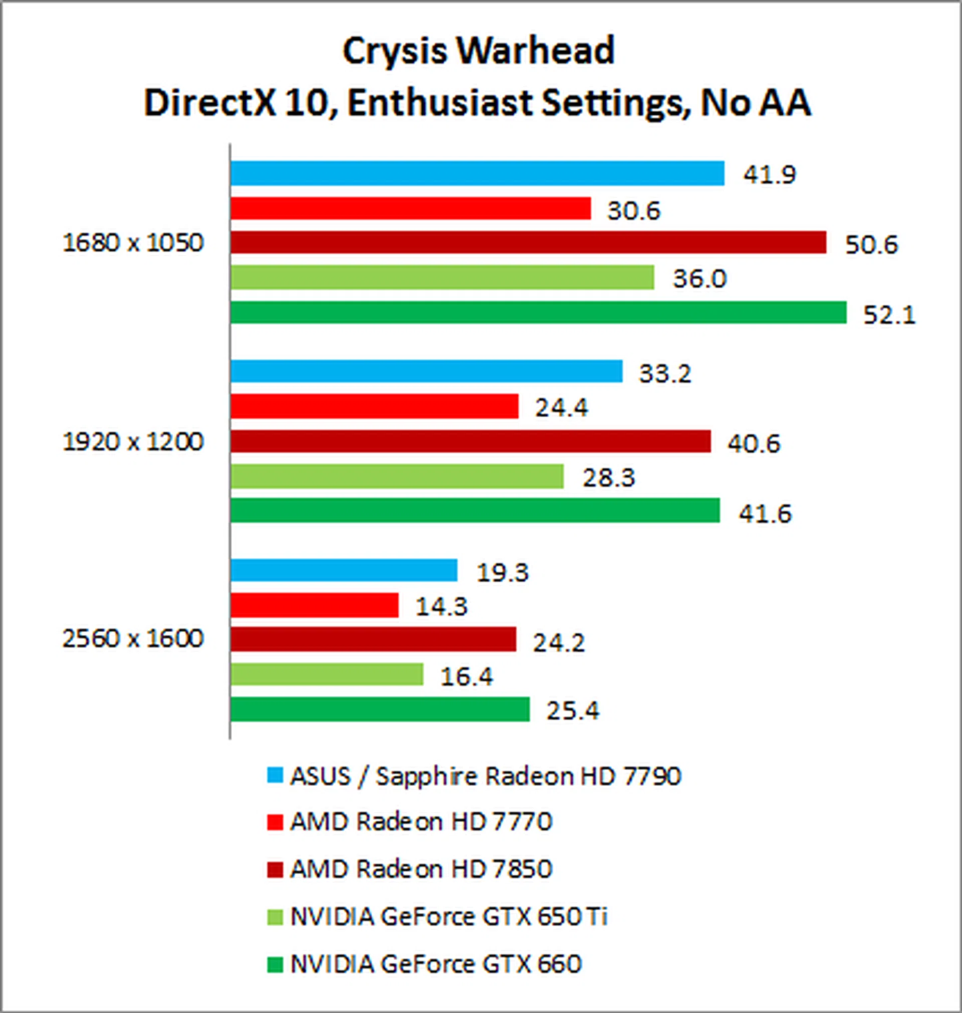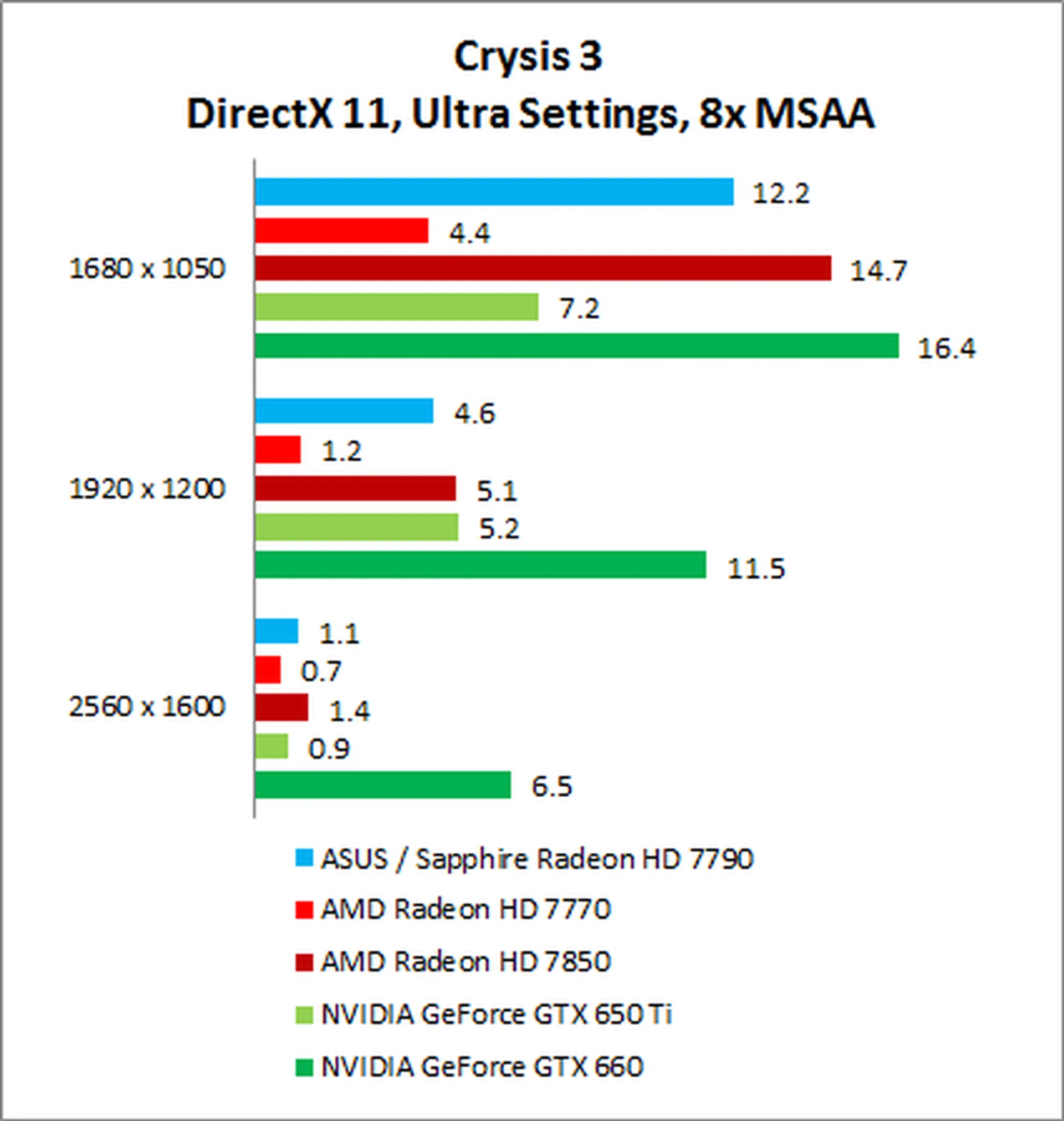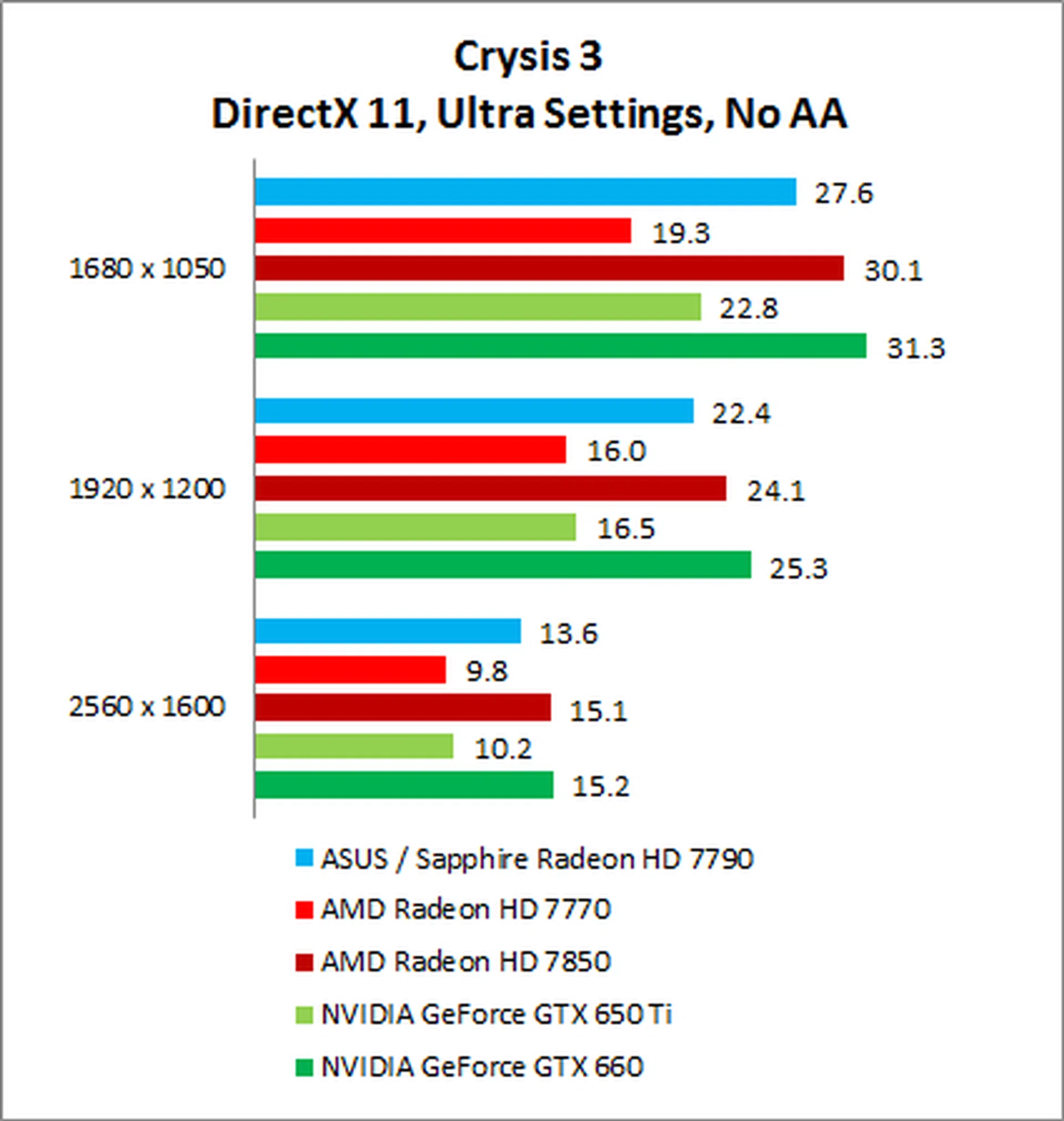 Crysis 3 is really not designed for mid-range graphics cards (especially at the maximum settings that we test at), although surprisingly, the HD 7790 performed quite well with AA turned off, trailing the HD 7850 by just a few FPS at all resolutions. While it wasn't able to achieve 30 FPS, dropping a few of the more intensive quality options down a notch should see playable frame rates.