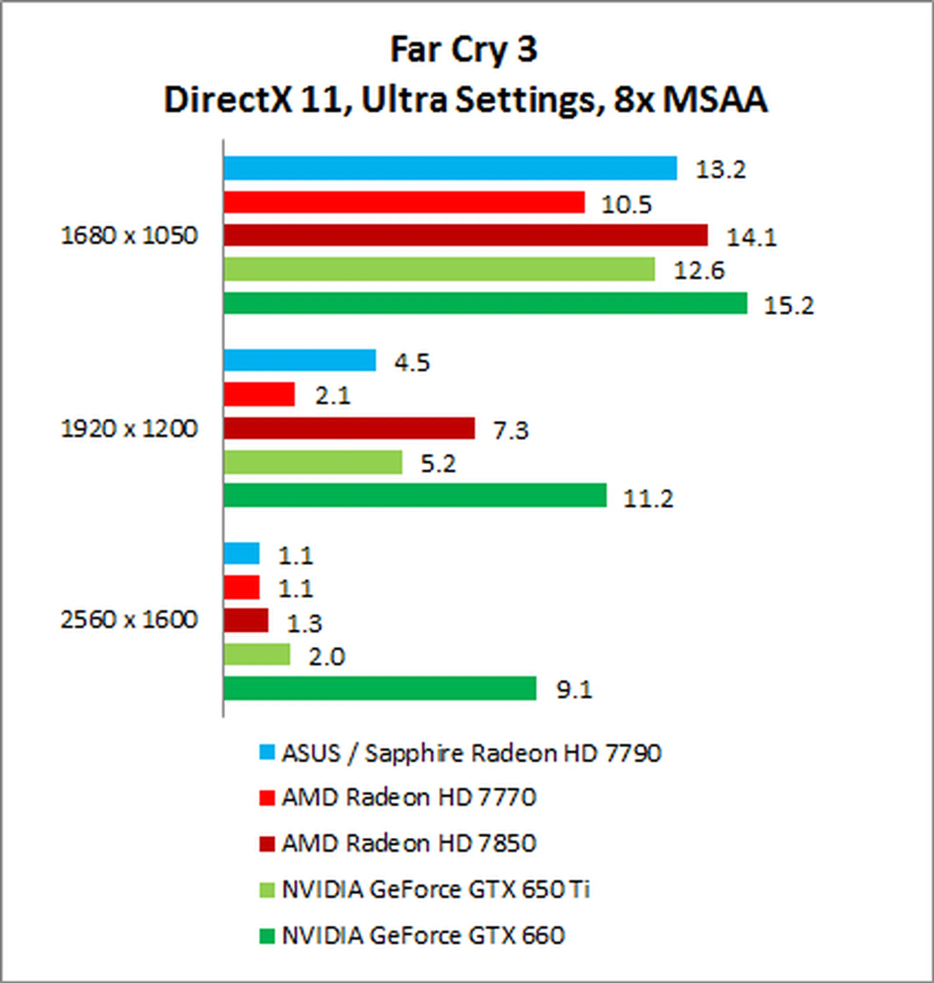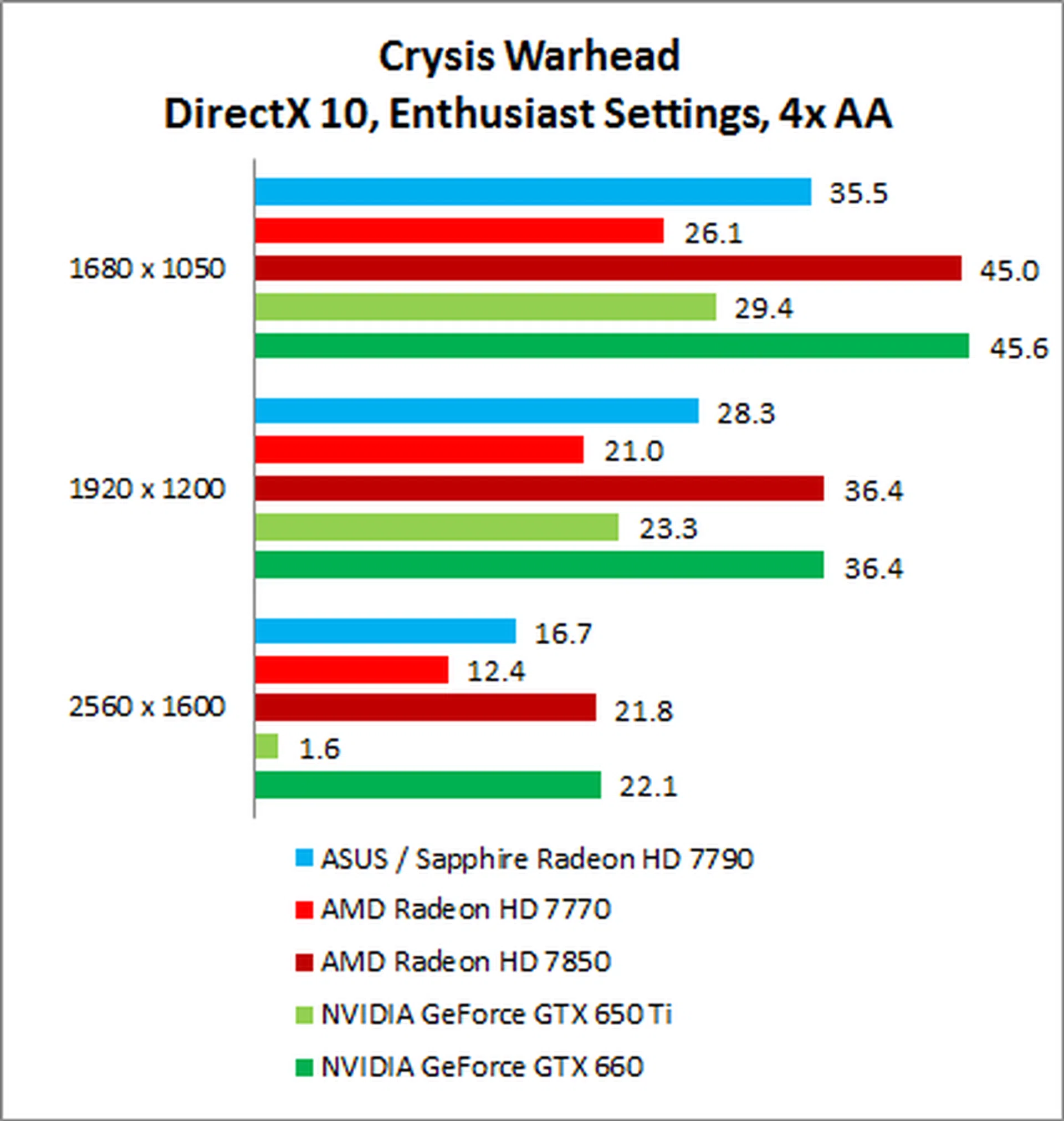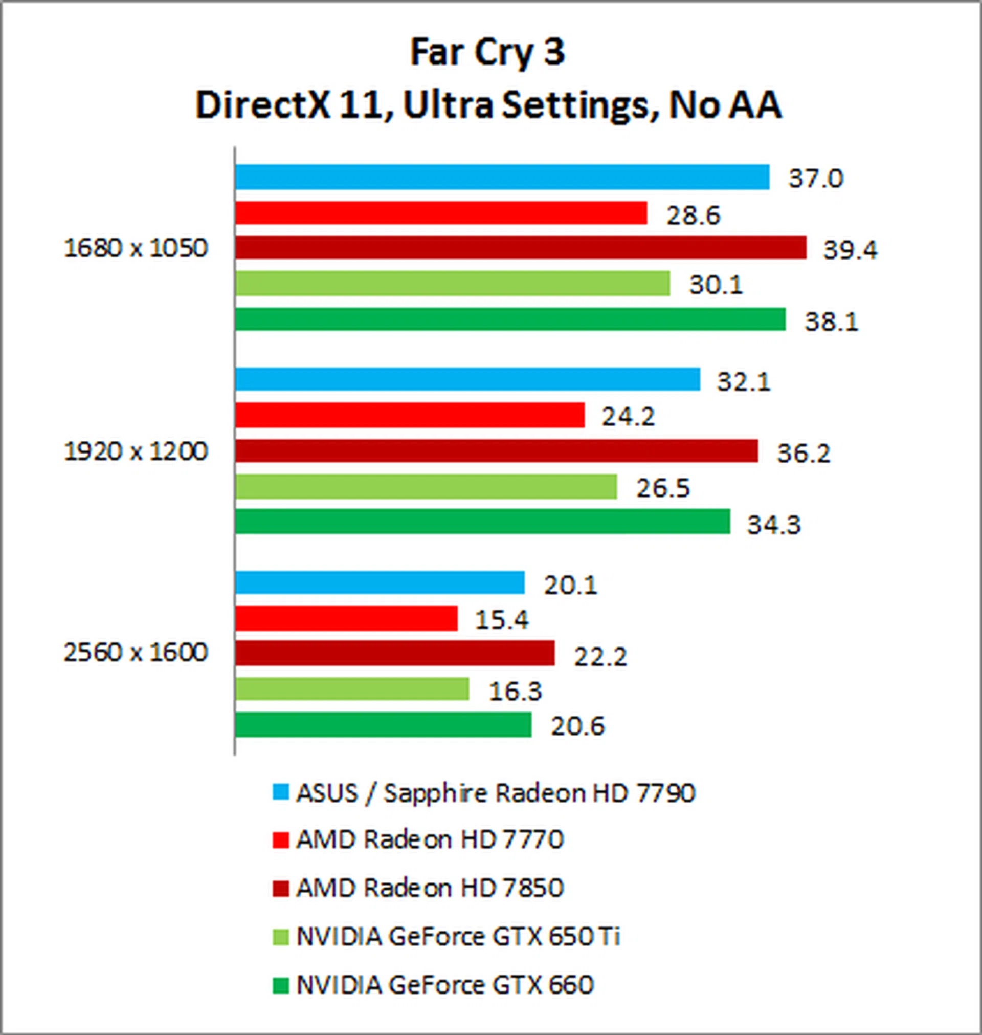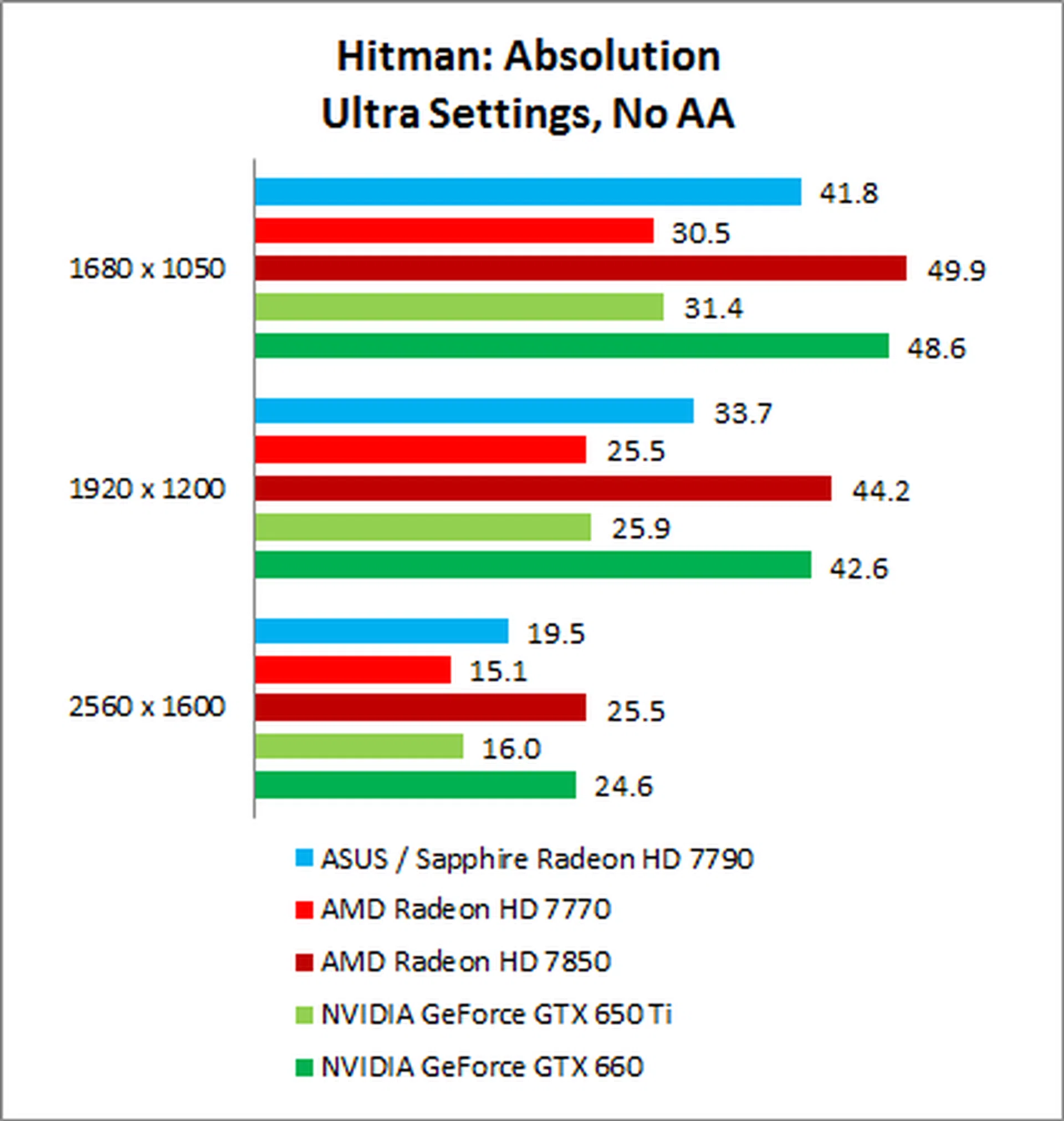 Crysis 3 is really not designed for mid-range graphics cards (especially at the maximum settings that we test at), although surprisingly, the HD 7790 performed quite well with AA turned off, trailing the HD 7850 by just a few FPS at all resolutions. While it wasn't able to achieve 30 FPS, dropping a few of the more intensive quality options down a notch should see playable frame rates.