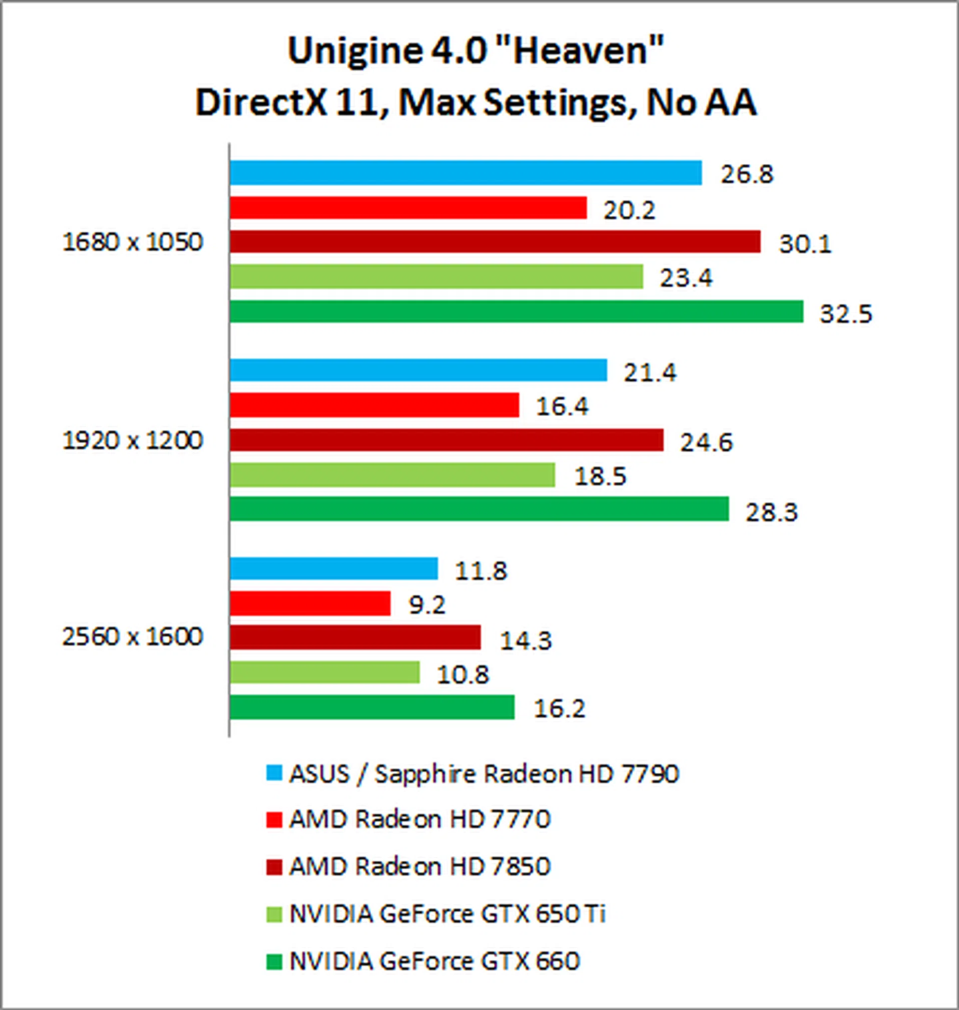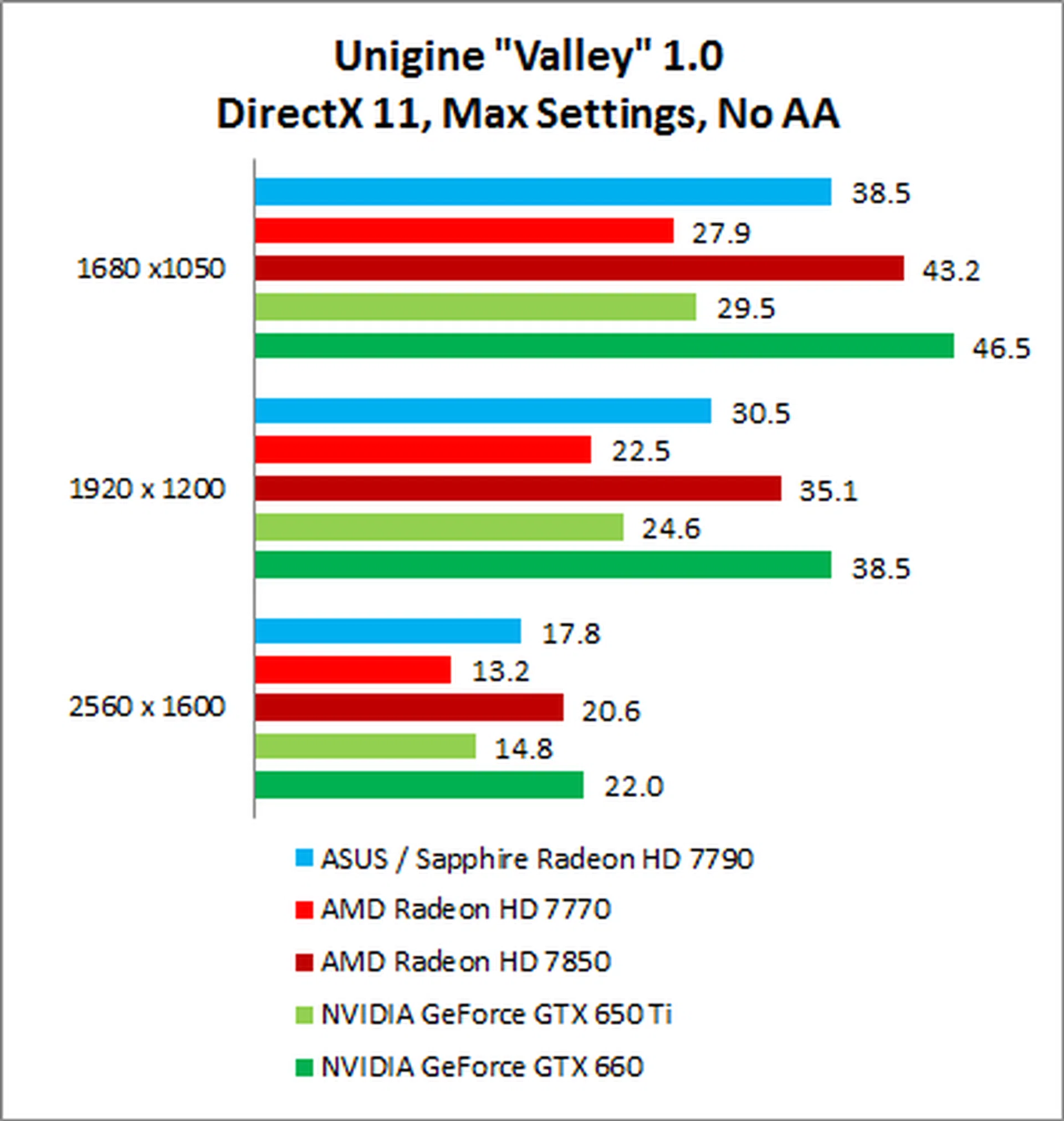 Across the board, the HD 7790 scored roughly halfway between the HD 7770 and HD 7850, trailing the HD 7850 by about 10-15%. The exception was at 2560 x 1600 resolution, at 8x AA settings, where again, it just did not have enough memory to benchmark successfully. Obviously, considering its mid-range specification, you shouldn't expect it to be able to perform well at higher than Full HD settings.