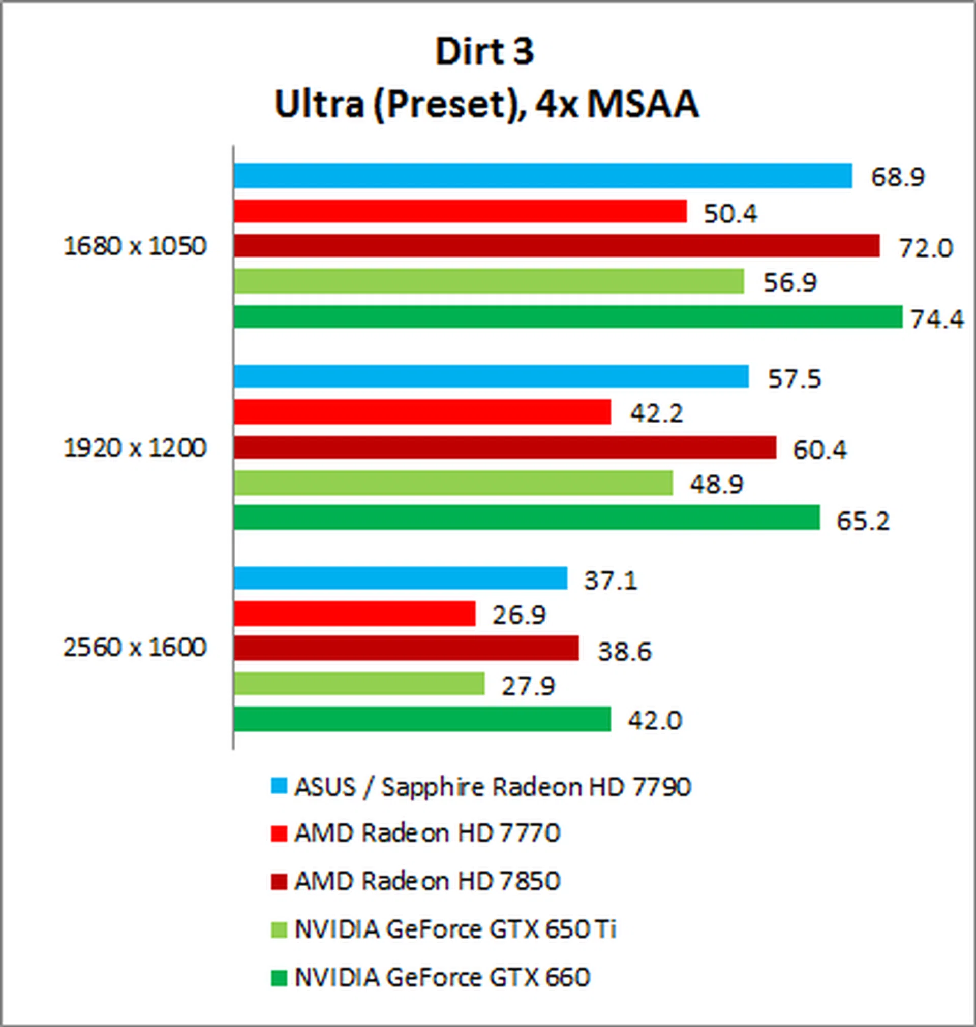 We saw a similar result on Dirt 3, with the HD 7790 trailing the HD 7850 by just 4% across all resolutions. At 2560 x 1600, this was just a 1 FPS difference.