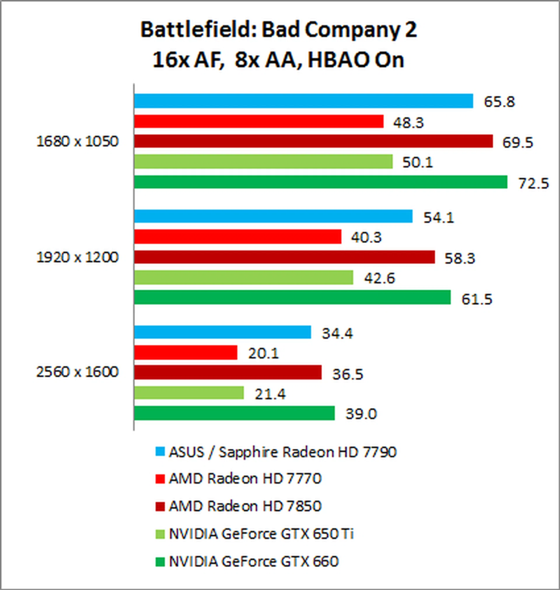 The HD 7790 performed much better on Battlefield: Bad Company 2, trailing the HD 7850 by just 6% across all resolutions.