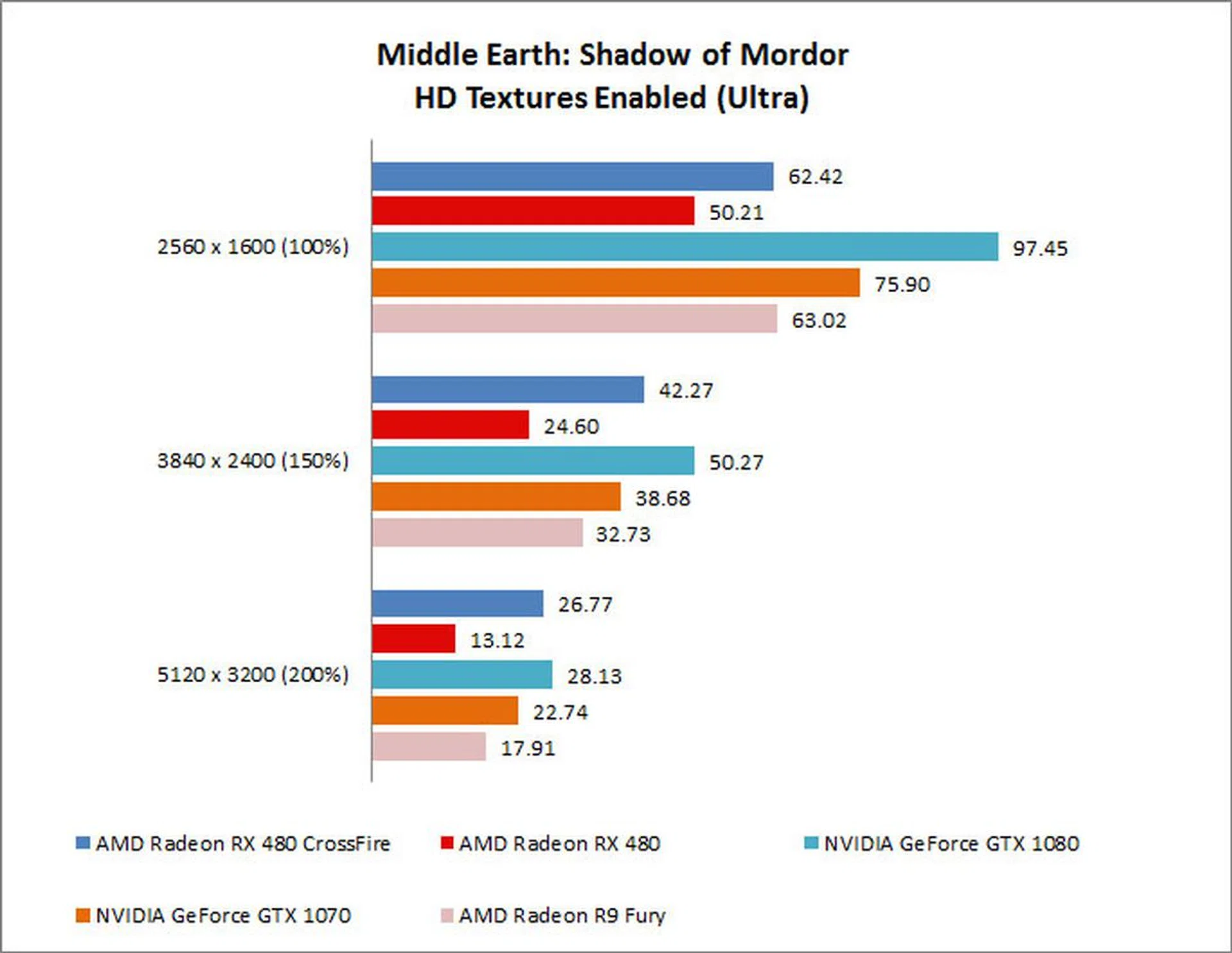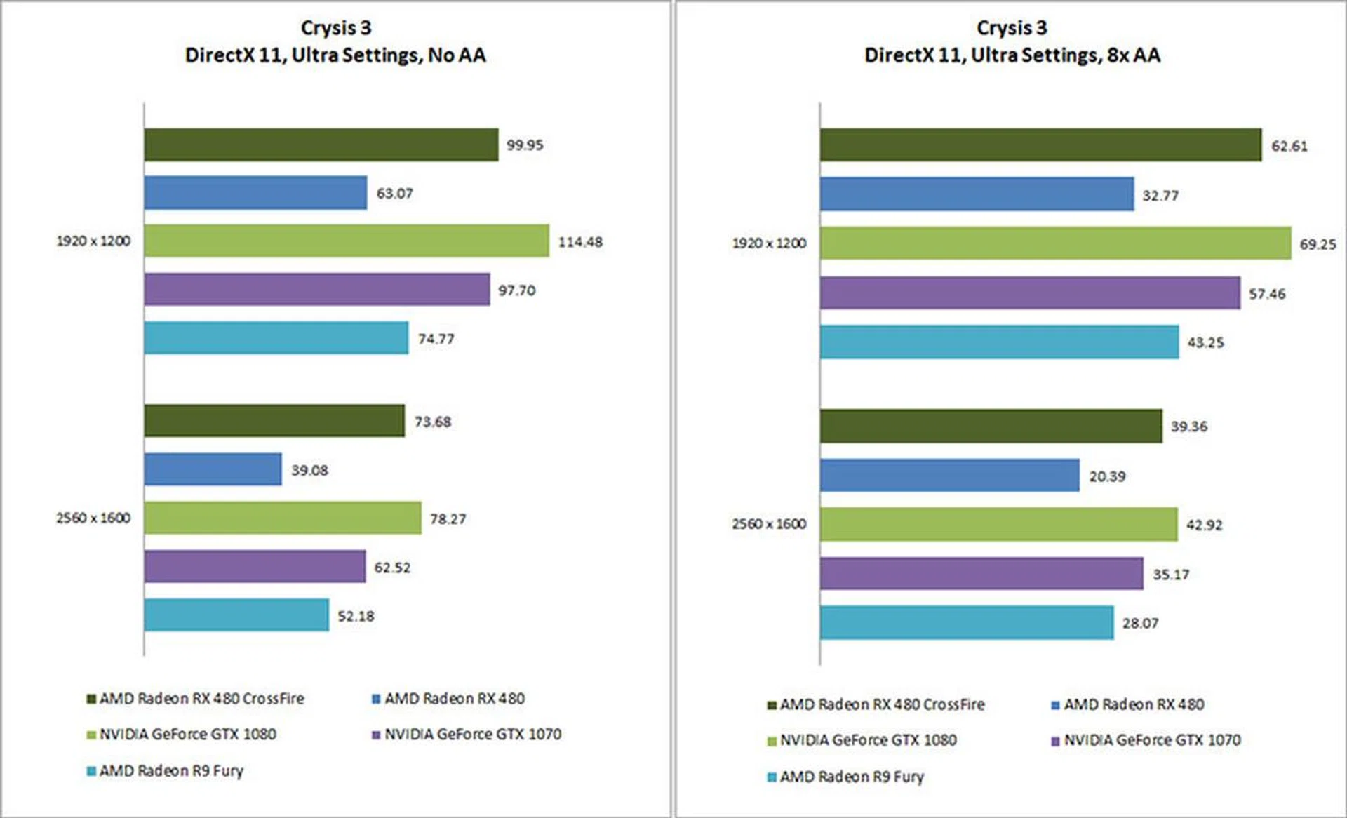 As it turns out, the largest benefit is derived at more demanding settings. This was the case in Crysis 3 as well, where there was a 93 percent improvement from just a single Radeon RX 480. However, the two cards in CrossFire still failed to beat the NVIDIA GeForce GTX 1080, although they did come quite close at the more graphically taxing settings. Having said that, they managed to edge out the NVIDIA GeForce GTX 1070, a nice feat in and of itself.