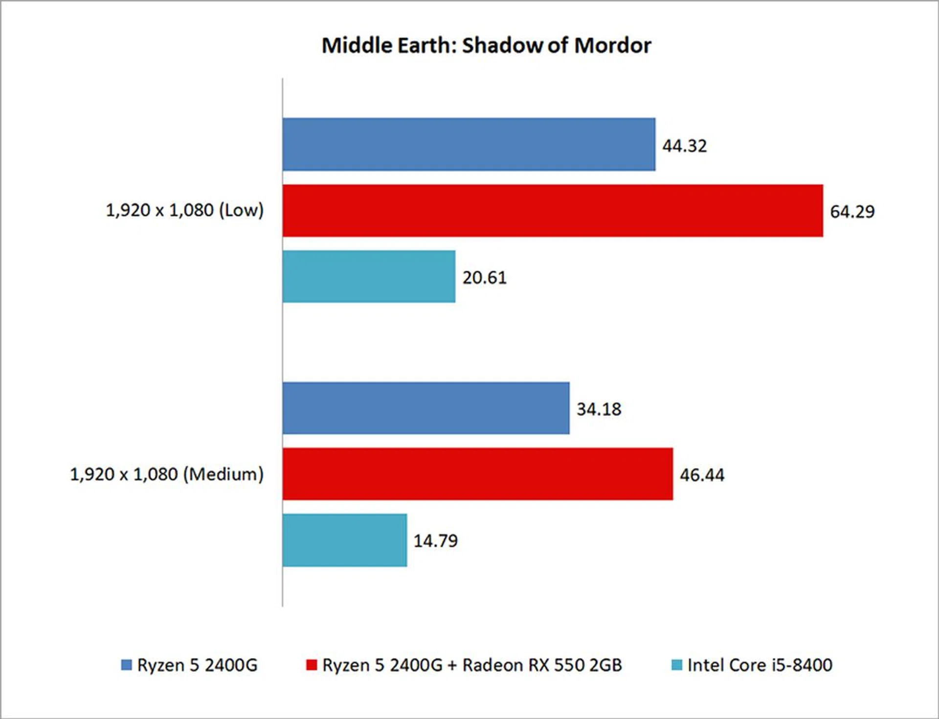 AMD’s APU did quite well on Shadow of Mordor as well, a relatively old title considering that we’re already in 2018. It was 115 per cent quicker than its Intel counterpart, once again cementing AMD’s lead in integrated graphics among the current generation of CPUs. Still, the Radeon RX 550’s advantage leapt to 45 per cent here, it’s largest yet.