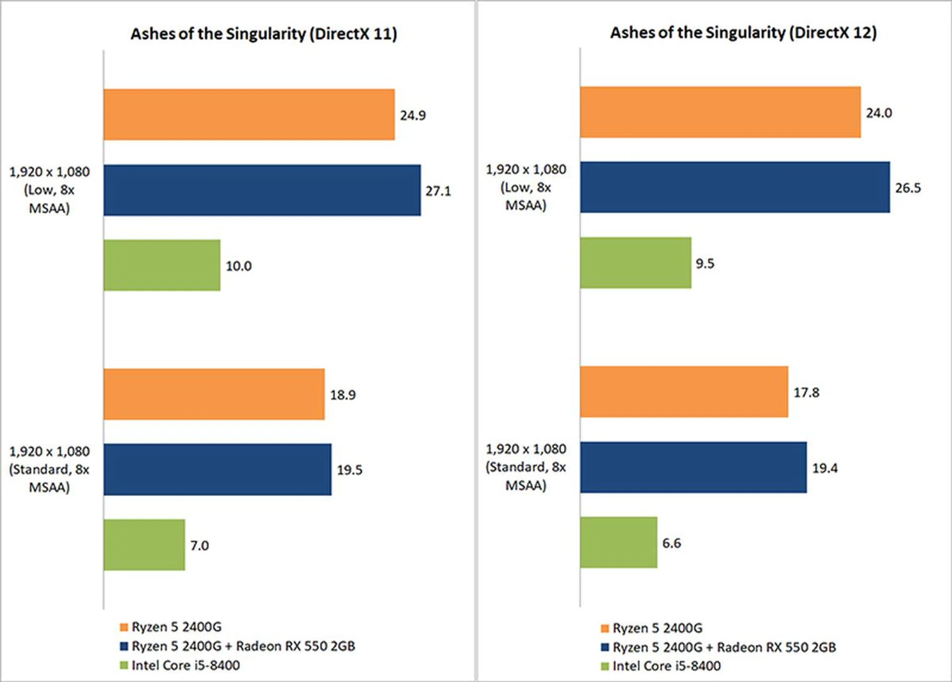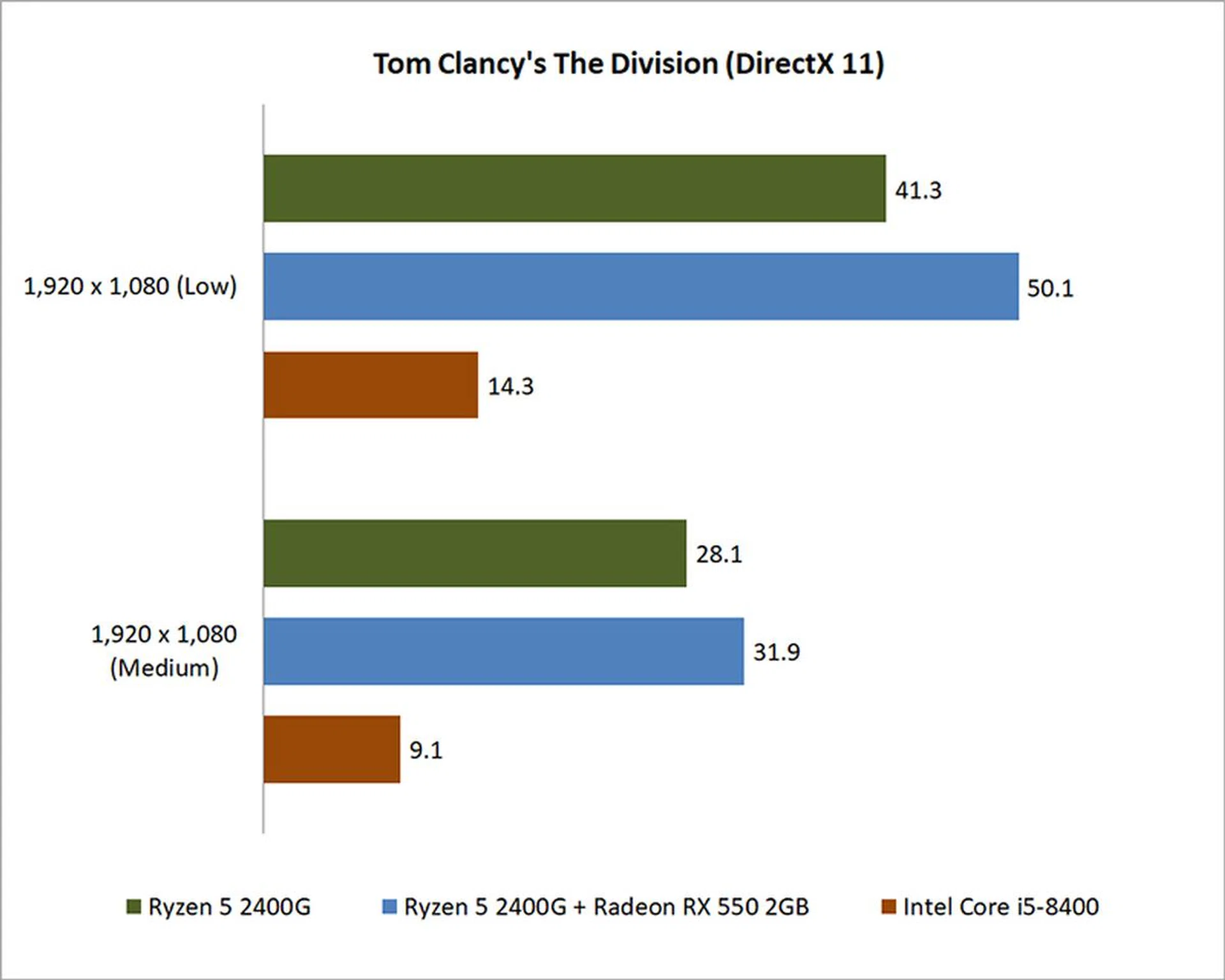 The Ryzen 5 2400G left the Core i5-8400 in the dust here again, where it was a whopping 149 per cent faster at Low settings. It also closed in on the Radeon RX 550, trailing it by just 8 per cent.