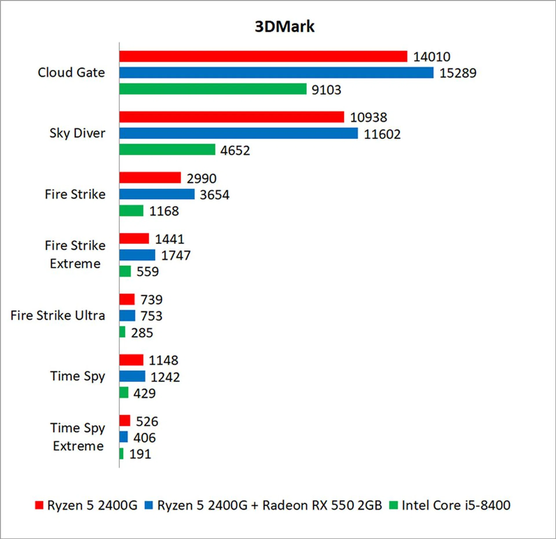 Furthermore, the Ryzen 5 2400G is clearly far ahead of the Intel UHD Graphics 630 on the Core i5-8400. It was a good 155 per cent faster in Fire Strike, completely outclassing Intel’s integrated graphics offering.