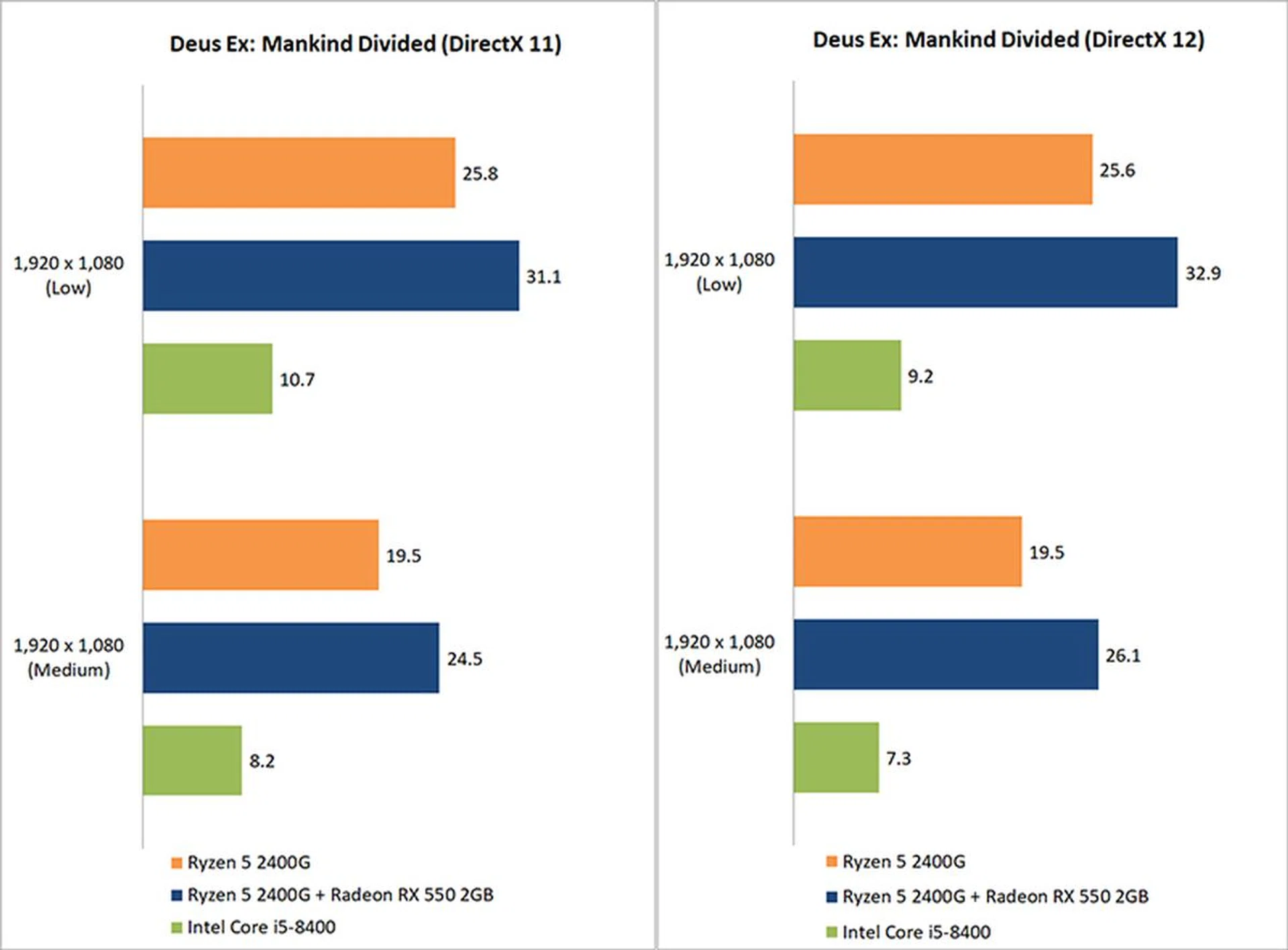 Mankind Divided is a rather demanding title, so it’s quite impressive that the Ryzen 5 2400G managed a sort of playable 25.8fps at Low settings. Yes, this isn’t going to be the smoothest experience, but I consider it quite a feat that the game didn’t devolve into a stuttering mess. On the other hand, the game was completely unplayable on the Core i5-8400.