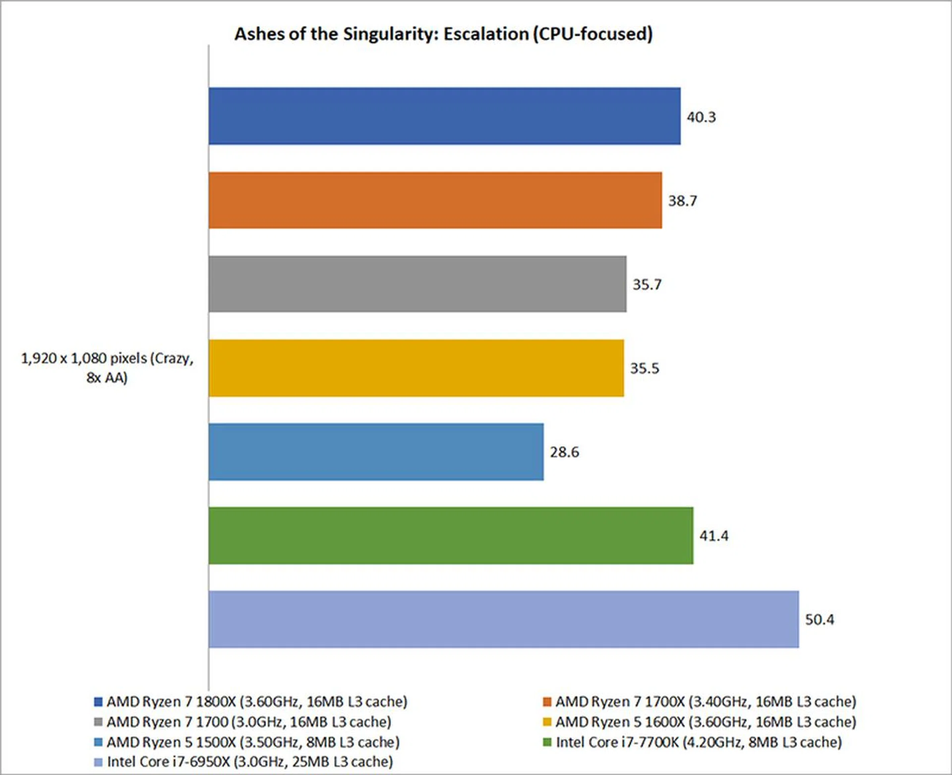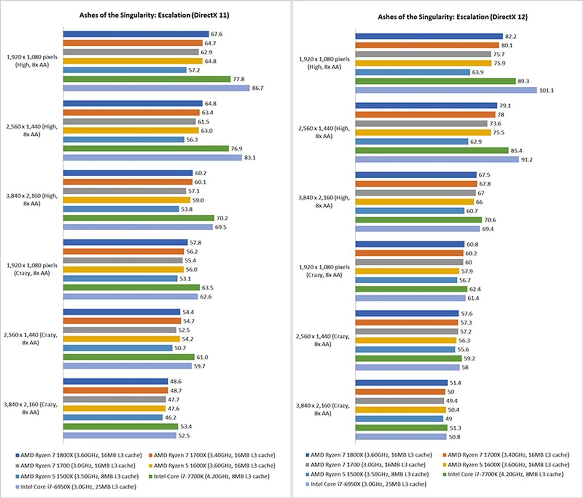 Here’s where things start to get interesting though. While Ashes of the Singularity was a study in frustration because of the failure of Ryzen to scale properly, the Escalation expansion professes to make things better with a patch that has been optimized for Ryzen. Starting from version 26118, you should see fairly significant improvements because the game is now better able to utilize Ryzen’s unique hardware.