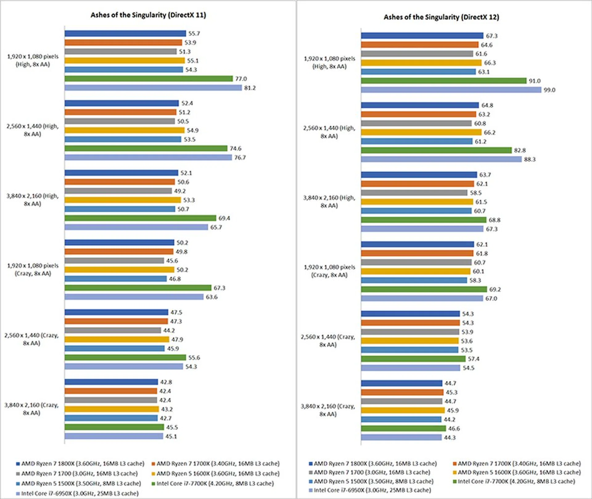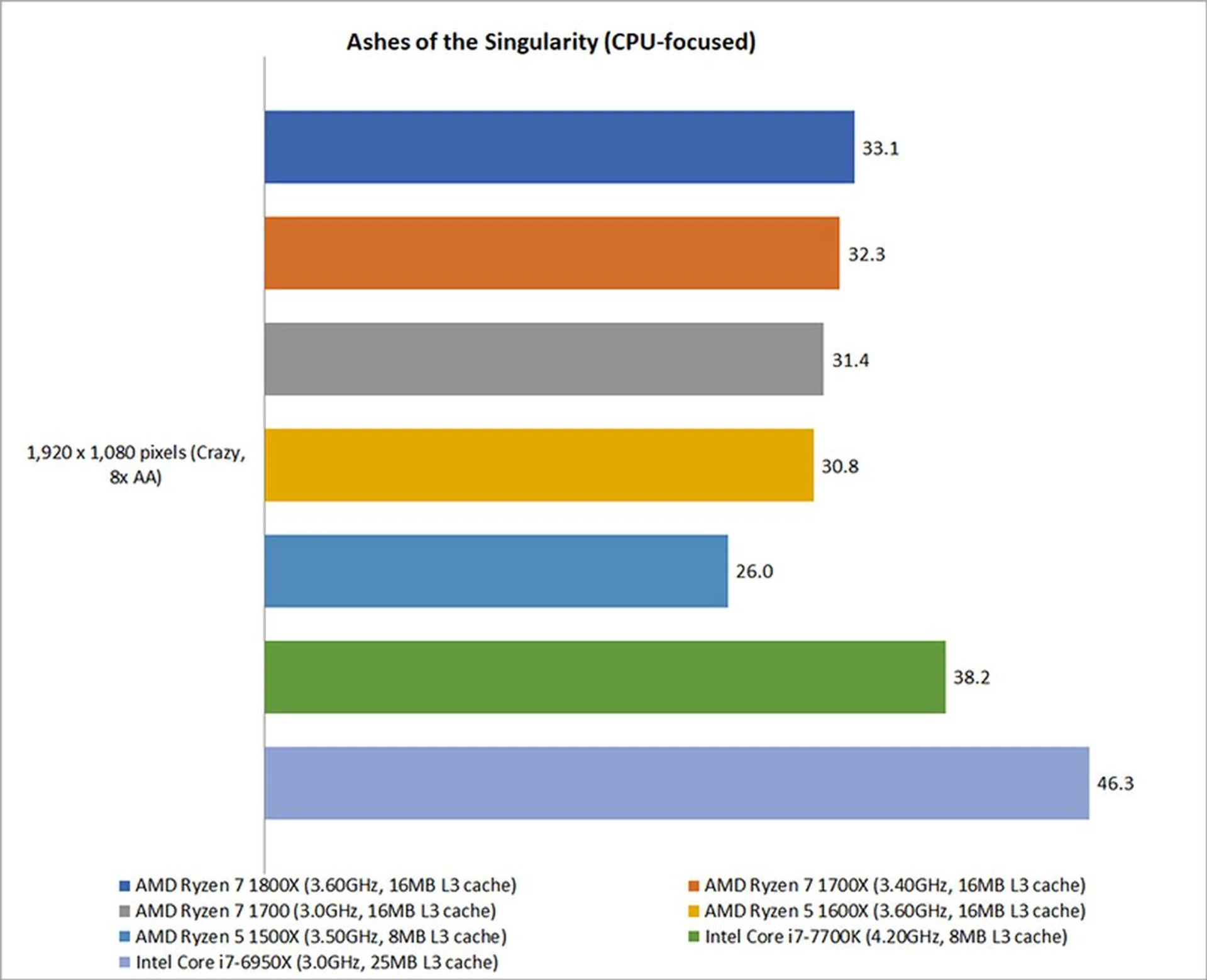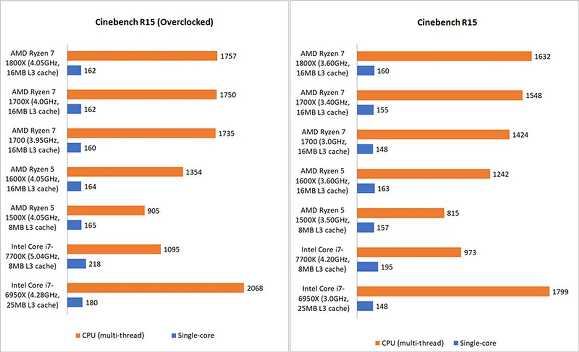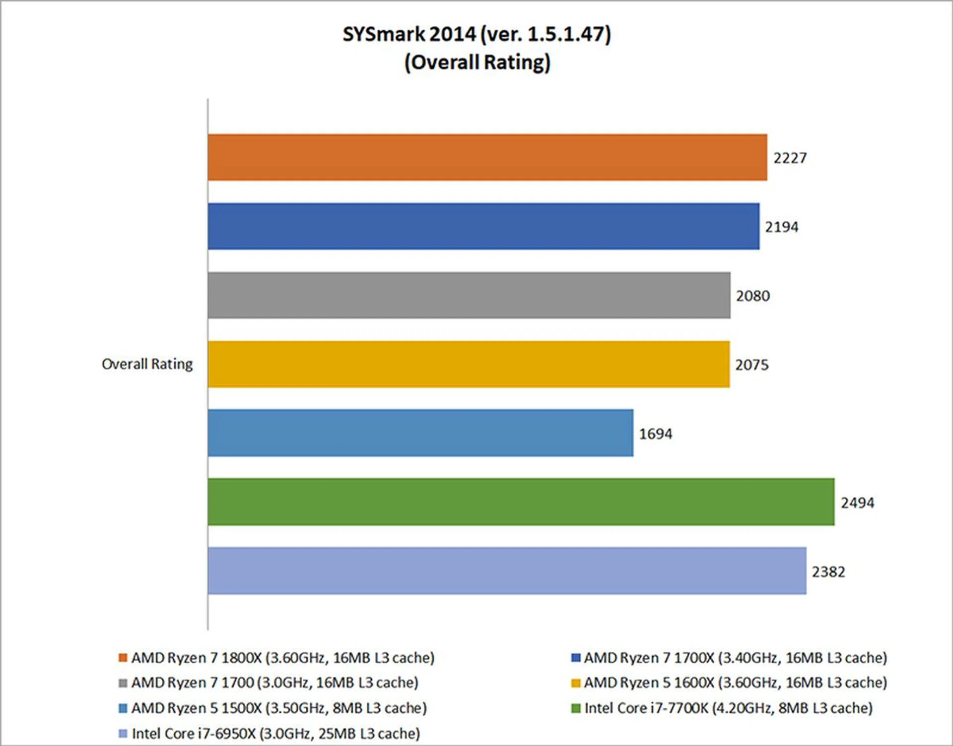 AMD Ryzen 7 1800X (3.60GHz, 16MB L3 cache) | AMD Ryzen 7 1700X (3.40GHz, 16MB L3 cache) | AMD Ryzen 7 1700 (3.0GHz, 16MB L3 cache) | AMD Ryzen 5 1600X (3.60GHz, 16MB L3 cache) | AMD Ryzen 5 1500X (3.50GHz, 8MB L3 cache) | Intel Core i7-7700K (4.20GHz, 8MB L3 cache) | Intel Core i7-6950X (3.0GHz, 25MB L3 cache) | |
