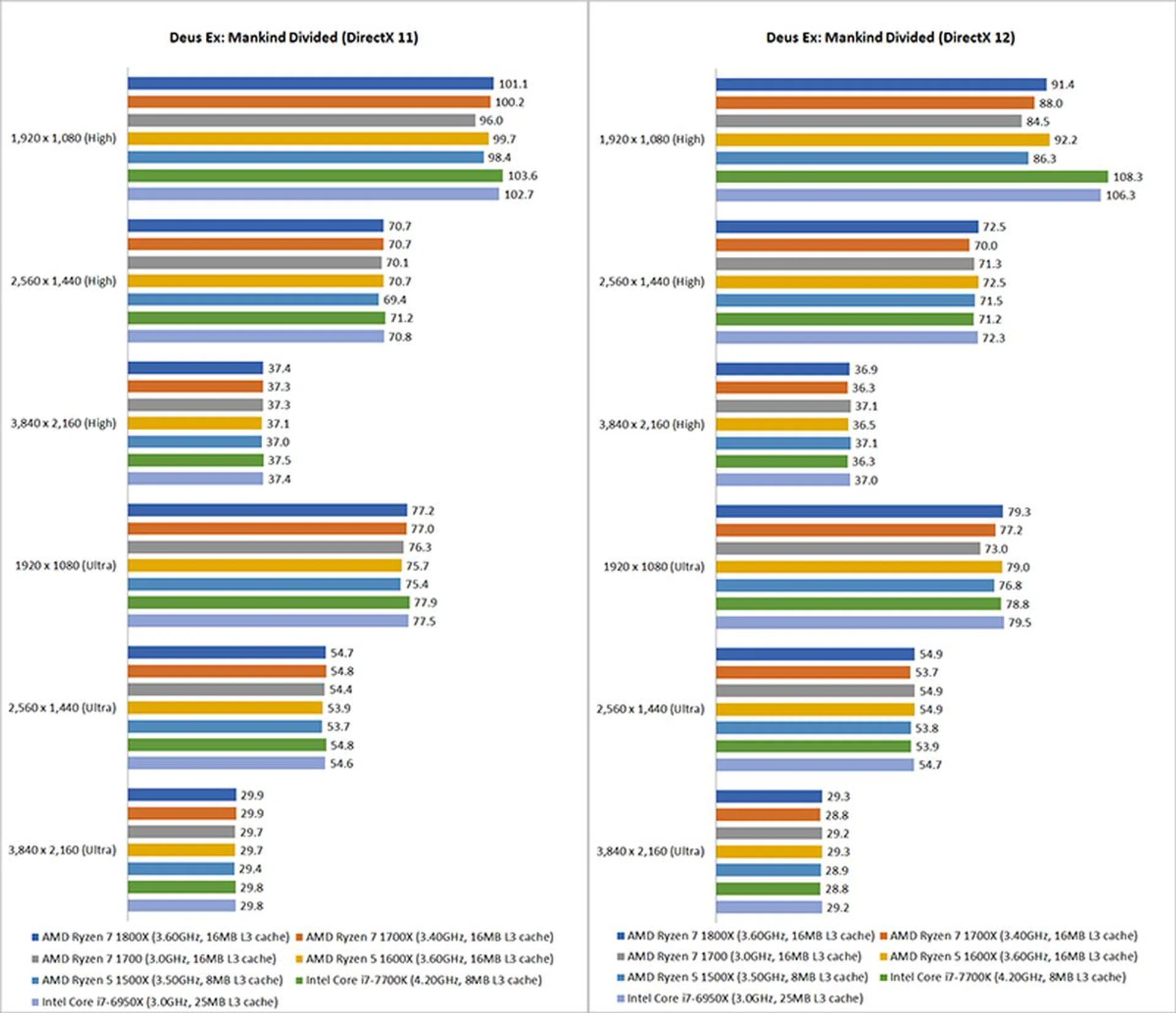 Furthermore, the minuscule differences between performance at 1080p and 4K in DirectX 11 show that the Ryzen CPUs are the limiting factor here. In comparison, the Intel CPUs exhibited far more marked performance variations when scaling between resolutions.