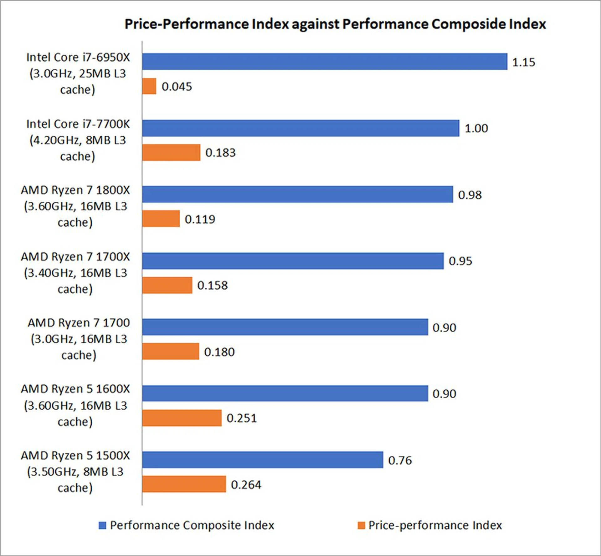 Ultimately, the Ryzen 5 1600X and 1500X had the two highest price-performance indexes thanks to their relatively competitive performance and attractive prices. The Ryzen 5 1600X stands out in particular because of how close its performance is to the Ryzen 7 1800X, which is more than twice its price.