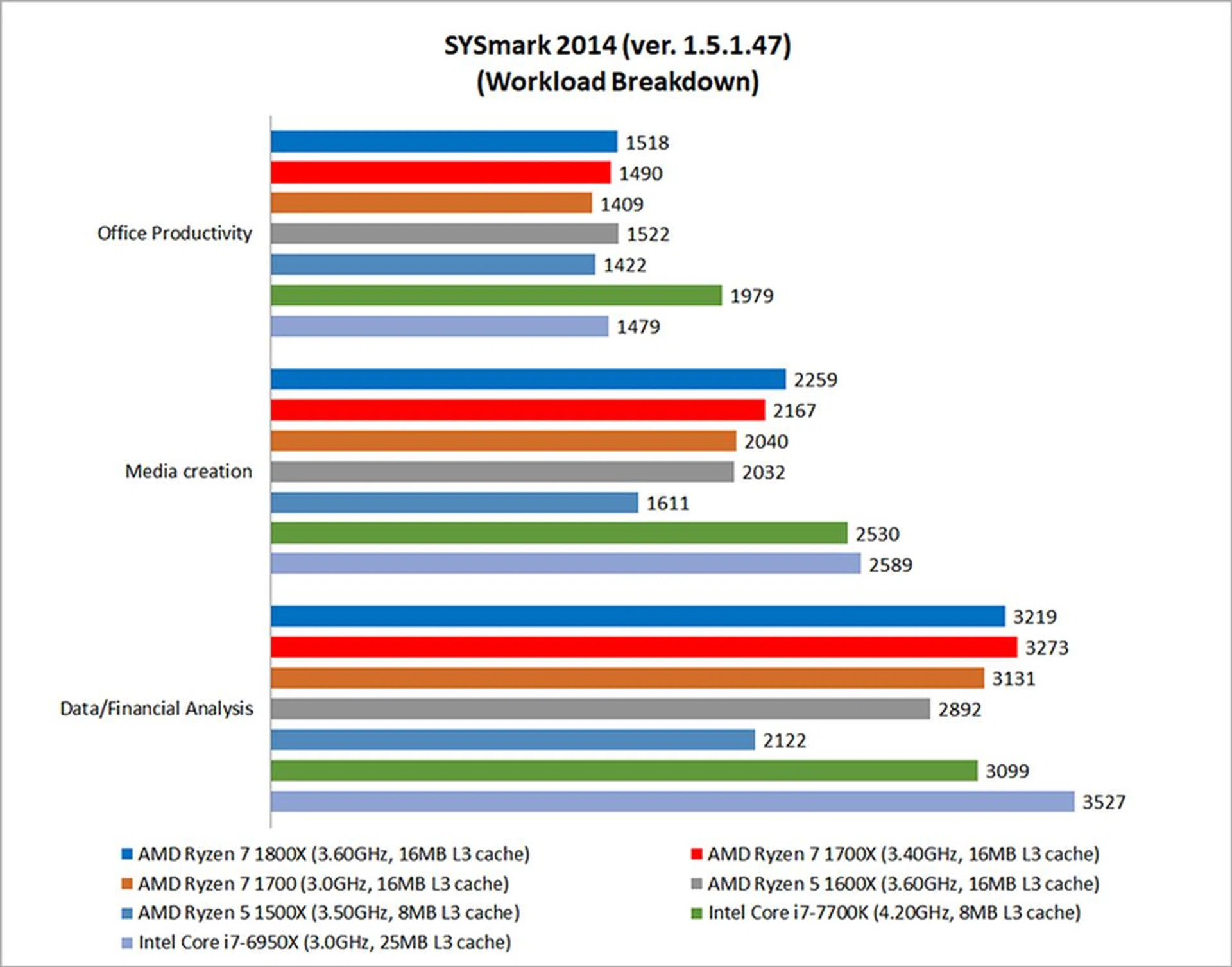 A look at the score breakdowns also shows that the Ryzen 7 chips excel in data/financial analysis-type tasks, which involves crunching, compressing and decompressing data to make forecasts and projections. Here, they were only behind the 10-core Intel Core i7-6950X.