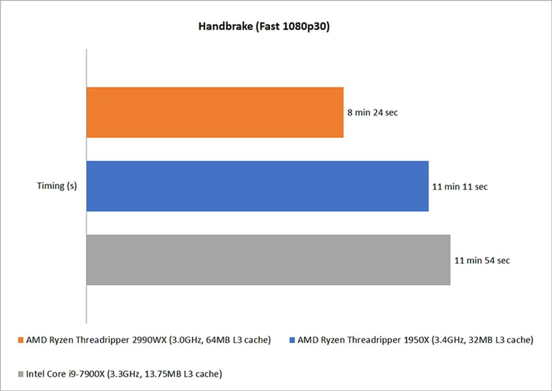 The 64 threads on the Threadripper 2900WX helped it edge ahead here while transcoding a 1.5GB .mkv file. It's a good bit faster than the 1950X and Core i9-7900X, even though we've observed that Handbrake tends to evince diminishing returns beyond six cores.