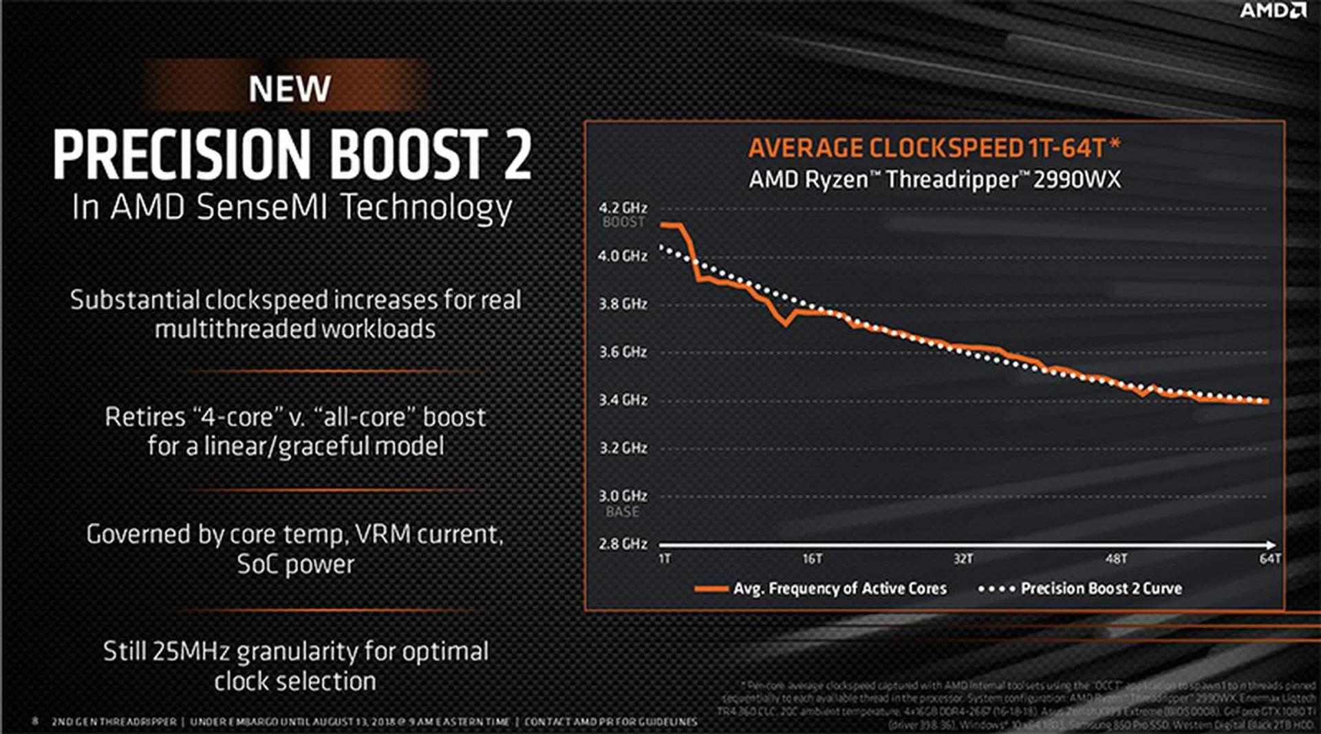 The second-generation Threadripper processors support Precision Boost 2, which is a new and more opportunistic frequency boosting algorithm governed by built-in temperature, current, and clock speed limits.