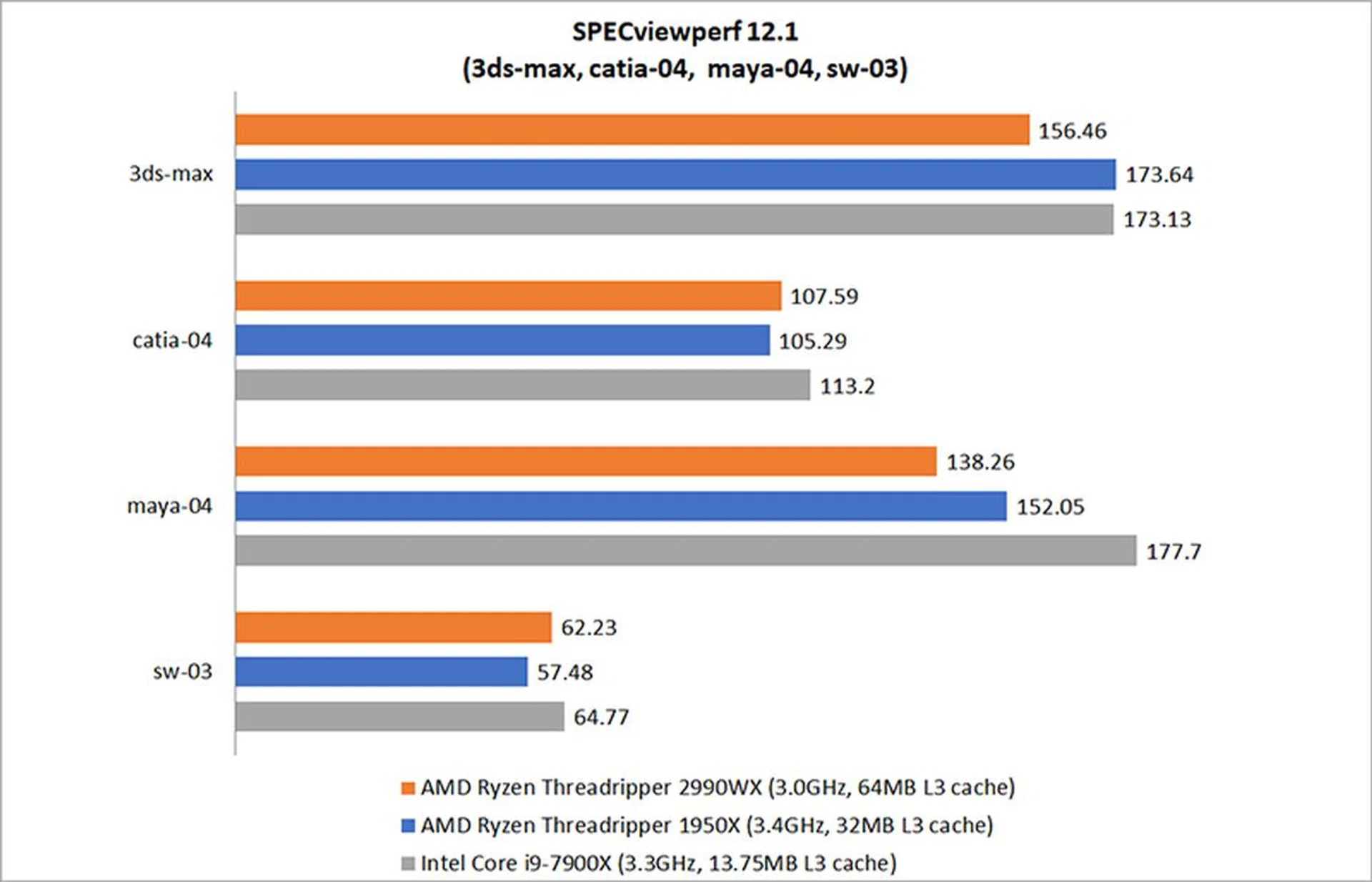 The Threadripper 2990WX didn't do well here, falling behing the 1950X and Intel Core i9-7900X in a couple of benchmarks. It also seems like select viewsets such as maya-04 heavily favor the higher clock speeds offered by the Intel Core X chip as both Threadripper chips ended up lagging behind.