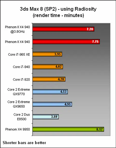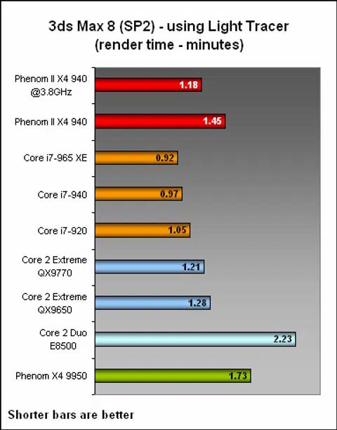 The answer it seems is an emphatic one. All the benchmarks showed a significant boost in scores, with PCMark05 even rating the overclocked Phenom II higher than the Core i7-965 Extreme for the CPU score. Improvements were evident throughout all the benchmarks, ranging from 6 - 15% in the gaming benchmarks, to more than 20% for Cinebench, XMpeg and 3ds Max 8 (using Light Tracer).