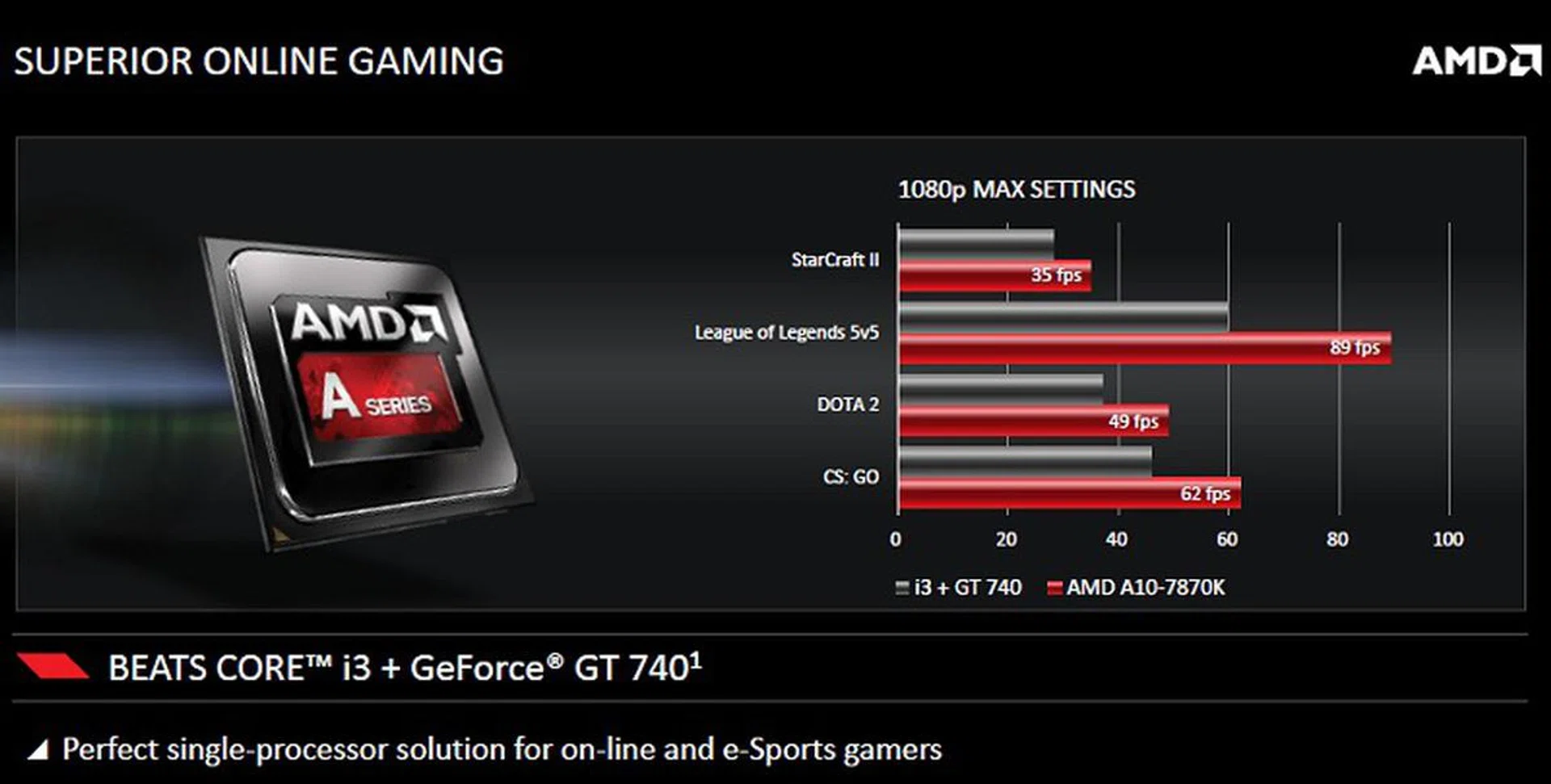 As a mainstream high performance APU product, AMD certainly understands for whom it is targeting the processor for. Simply said the A10-7870K's mission is to provide enough horsepower to power top online multiplayer games smoothly at Full HD resolution without needing to plug in a discrete GPU. Here are some results provided from AMD:-