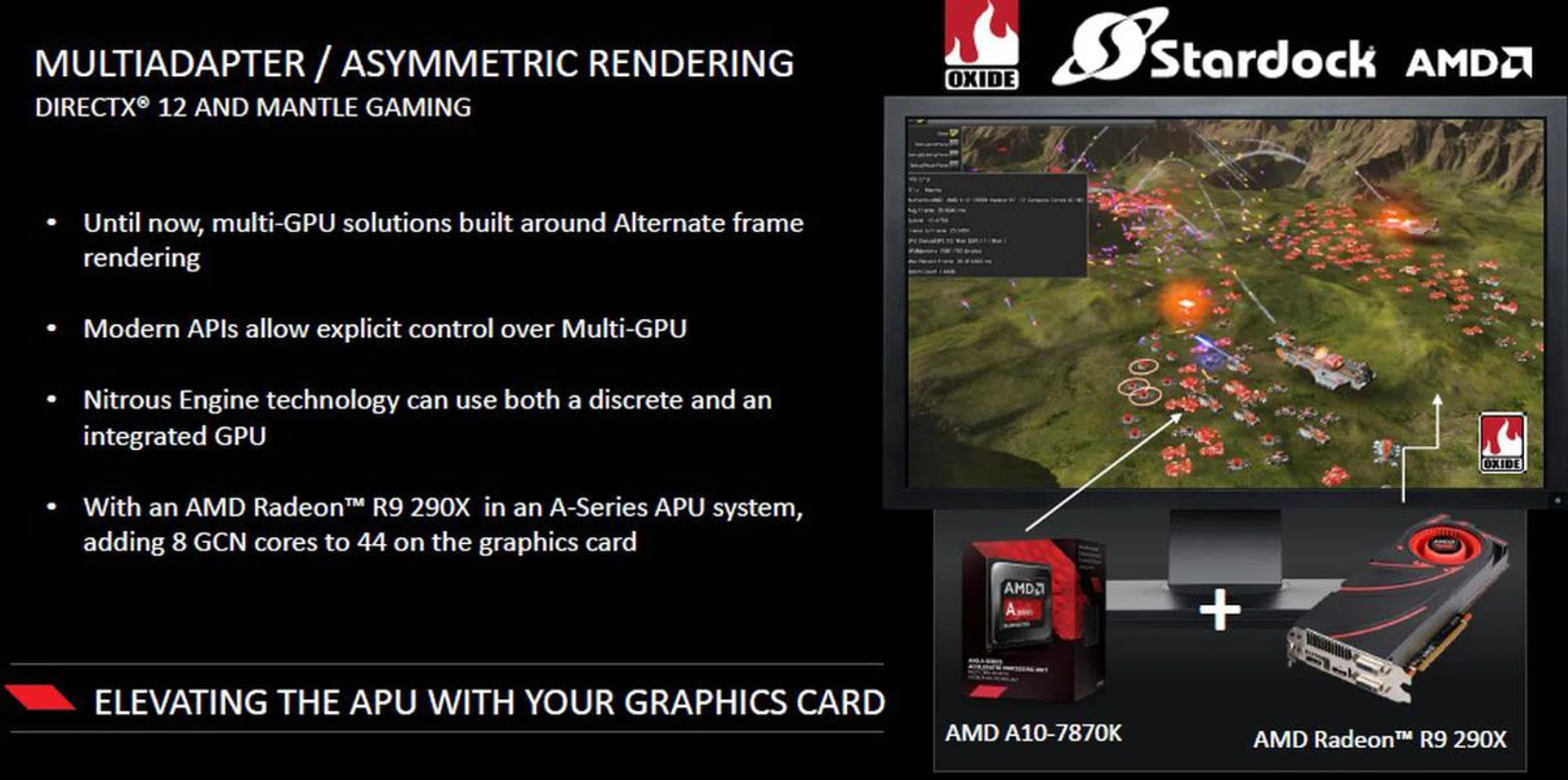 AMD was keen to show an example of this with a new RTS game called Ashes of Singularity by Oxide Games and Stardock Entertainment. It looks and feels like a massively updated Supreme Commander, but the Nitrous game engine it uses has support for Explicit Multi-adaptor and SFR features in DirectX 12. Thus it's able to use both discrete and an integrated GPU such as a Radeon R9 290X on a A10-7870K system - bringing together the 44 cores on the discrete GPU and 8 more from the integrated GPU for combined use. In a screenshot provided by the game developer, you can see that the red areas highlighted in the scene are all rendered by the APU's GPU and the rest by the discrete GPU.