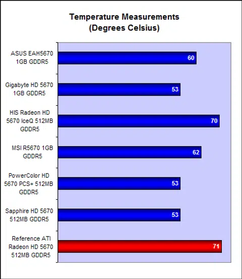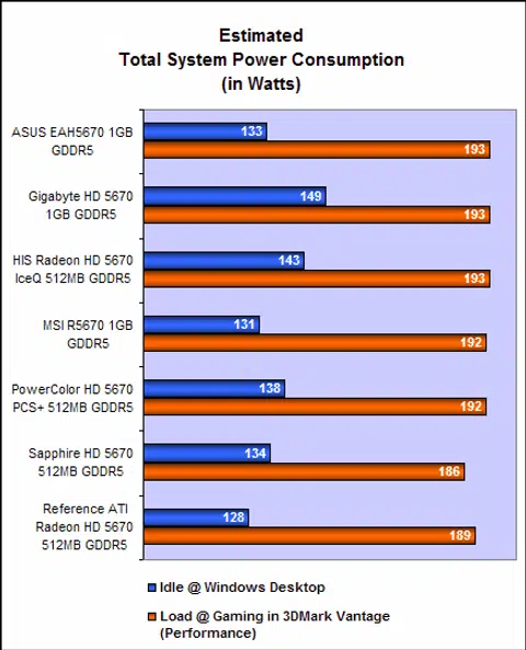 Power consumption figures of these cards were very similar to that of ATI's reference one. The only notable mentions here the slightly lower reading of the Sapphire HD 5670 at load. We also noted that the Gigabyte HD 5670 and HIS Radeon HD 5670 IceQ had marginally higher readings at idle.