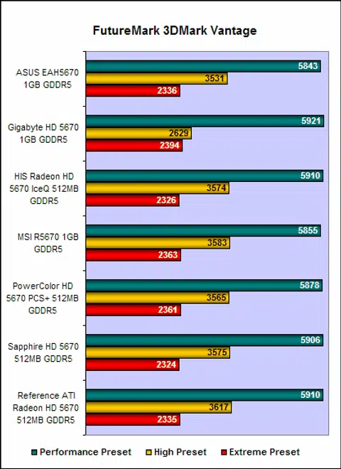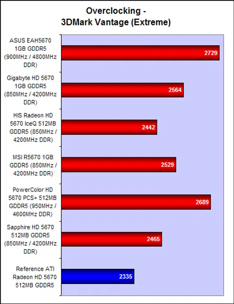 With the ASUS EAH5670, we managed to achieve 900MHz at the core and 4800MHz DDR , giving us 2729 3DMarks, the highest of the lot.