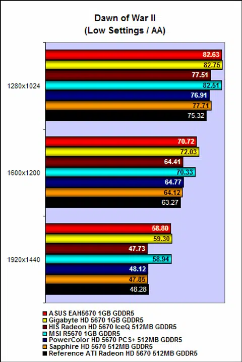 On Dawn of War 2, it was evident that the cards with 1GB of frame buffer have the upper hand. The gulf between the 1GB and 512MB was widest when running at 1920 x 1440, with the larger frame buffer cards posting a significant 23% gain in performance.