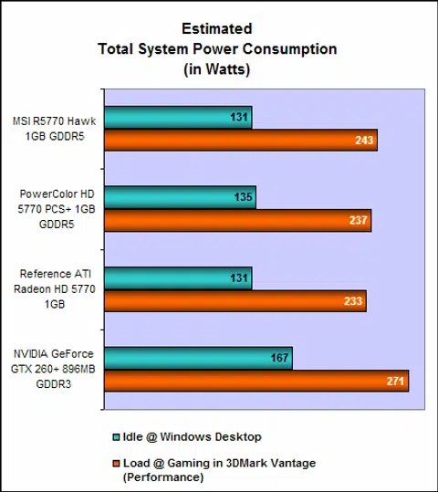 Power consumption figures of both cards were nearly identical, and comparable to that of a bone-stock Radeon HD 5770. Also note just how much more power-hungry is the GeForce GTX 260+.