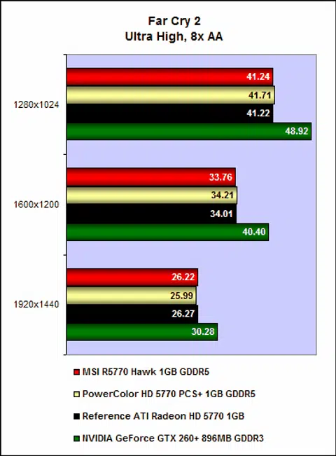 Far Cry 2 was pretty much the same story as well, with little separating the two Radeon HD 5570s. And again, it was the NVIDIA GeForce GTX 260+ that was quickest. And its superiority was most evident when anti-aliasing was enabled.