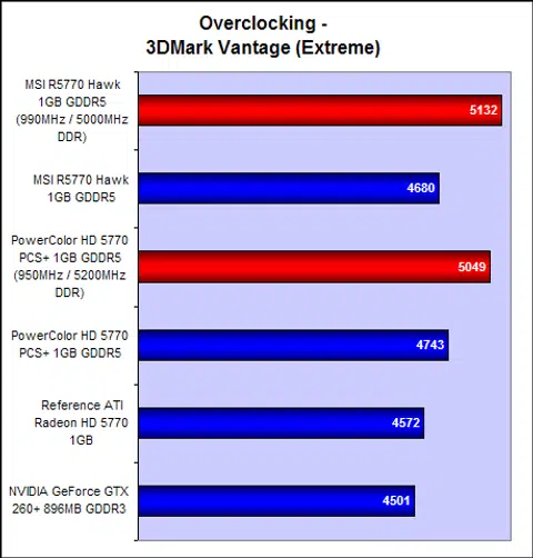 With the PowerColor HD 5770 PCS+, we could only manage 950MHz at the core and 5200MHz DDR, still pretty impressive. This gave us 5049 3DMarks on the Extreme preset, marking an improvement of 6% (but note that the PowerColor's card is higher clocked by default).