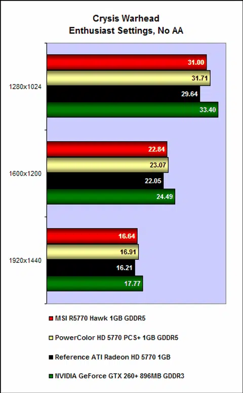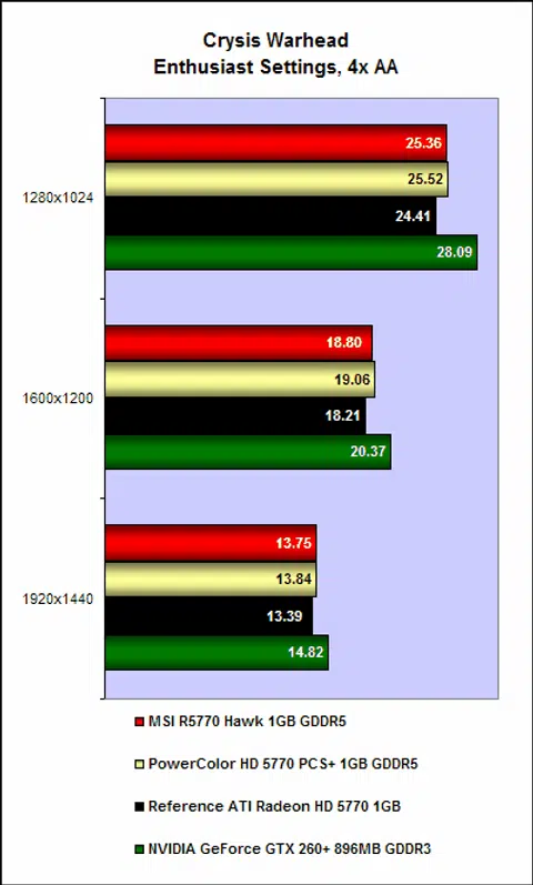 It was the same story on Crysis Warhead, with both cards posting nearly identical frame rates. In fact, the PowerColor HD 5770 PCS+ was on average only about ½ a frame quicker than the MSI R5770 Hawk. Also note that despite the boosted clock speeds, both factory-overclocked Radeon HD 5770 cards were no match for a reference NVIDIA GeForce GTX 260+.
