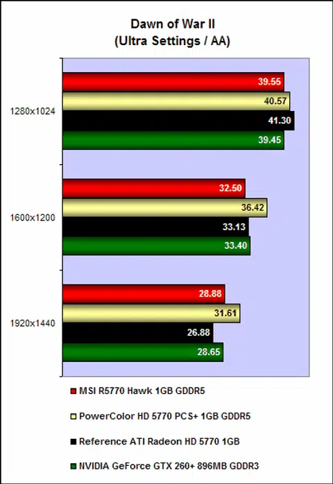 Dawn of War 2 was a little more interesting, as the PowerColor HD 5770 PCS+ performed noticeably better when we increased the resolution. In fact, it was able to outperform the NVIDIA GeForce GTX 260+, which has been dominating thus far.