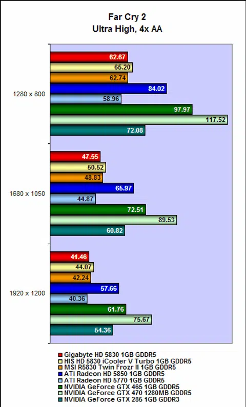 Far Cry 2 is a game that has traditionally been dominated by the NVIDIA cards, and it was the same here. The GeForce GTX 470 is by far the fastest card, and even the less powerful GeForce GTX 465 could give the Radeon HD 5850 a run for its money.
