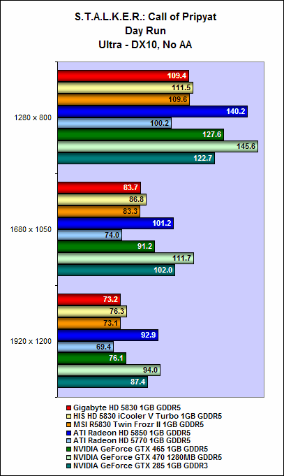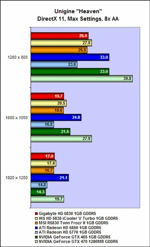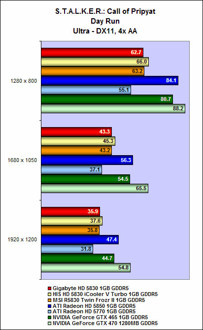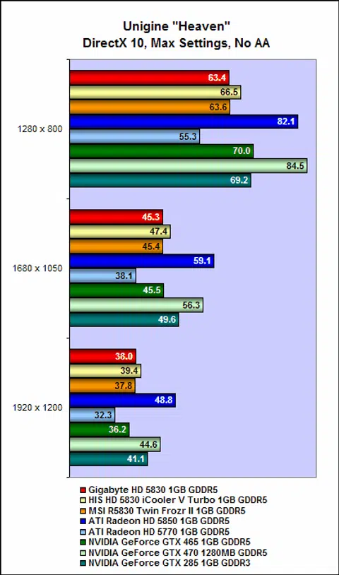 As we've anticipated, the HIS card continued to outperform the other two reference clocked cards from Gigabyte and MSI. Its lead, however, was very slight. And overall, the Radeon HD 5830's performance was between that of the Radeon HD 5850 and HD 5770. Against its closest competitor from the green camp, the GeForce GTX 465, the Radeon HD 5830 was mostly slower, but was able to catch up once we upped the resolution.