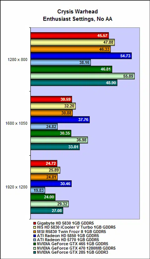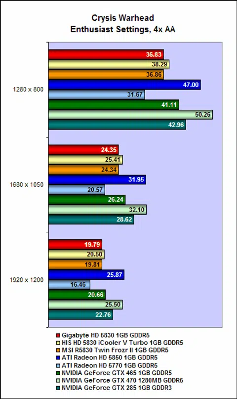 On Crysis Warhead, we noticed the HIS card taking a lead against the Gigabyte and MSI cards, which is not surprising seeing that it is factory overclocked. We also noticed that the performance of the Radeon HD 5830 is, once again, in the middle between the Radeon HD 5850 and HD 5770. It was also able to keep up with the GeForce GTX 465, but showed signs of slowing down when we enabled anti-aliasing.