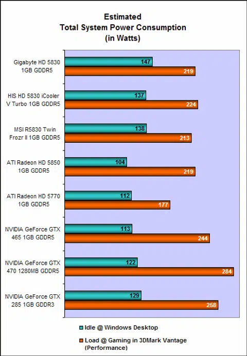 Despite the hardware reduction, the power consumption figures we recorded from our triplet of Radeon HD 5830 cards were comparable to that of the Radeon HD 5850. We suspect this is due to the Radeon HD 5830's higher reference clock speeds. If you recall, a reference Radeon HD 5830 is running at 800MHz at the core, whereas the Radeon HD 5850 is only running at 725MHz. Add to that is the same GPU core used on the 5850 and 5830 models, the results are quite apparent. That said, all three Radeon HD 5830 cards recorded roughly the same figures.