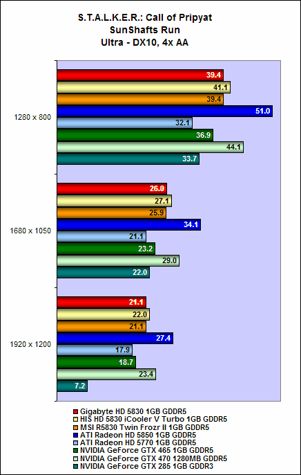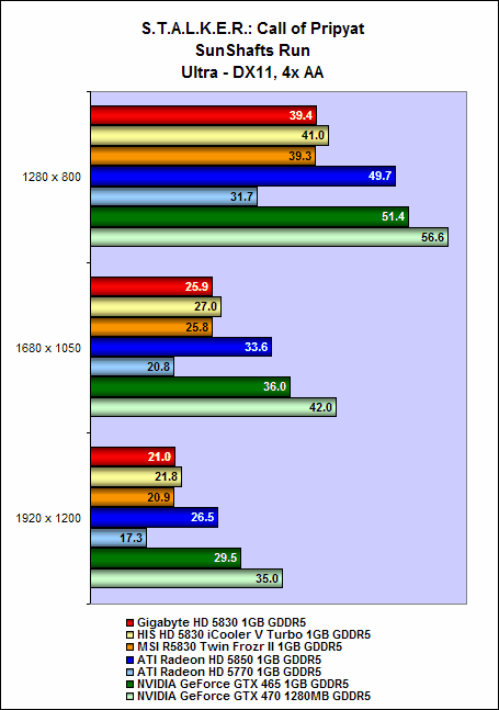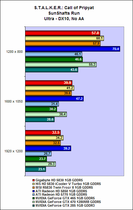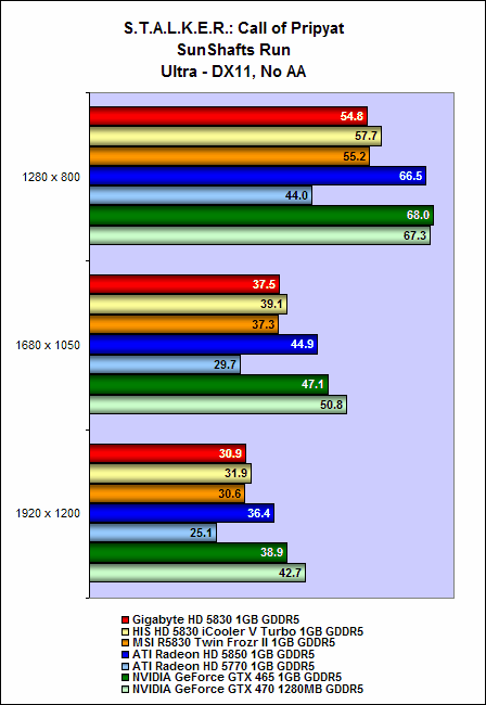 On our last benchmark, the HIS card continued to maintain its slight lead over the reference clocked Gigabyte and MSI cards. And in general, the Radeon HD 5830 did as it was expected to, coming in between the Radeon HD 5850 and HD 5770. Against the GeForce GTX 465, it wasn't as competitive, being thoroughly outclassed on most of the runs and settings. The only time it caught up with the GeForce GTX 465 was when running the SunShafts run in DirectX 10.