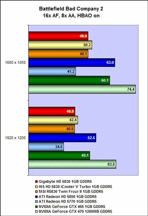 On Bad Company 2, the factory overclocked HIS card once again found itself outperforming the reference clocked Gigabyte and MSI cards. And on a whole, the Radeon HD 5830 found itself sandwiched between the Radeon HD 5850 and HD 5770, which has been the case thus far. However, performance on Bad Company 2 leans more towards the less powerful Radeon HD 5770. And while the Radeon HD 5830 was able to keep up with the GeForce GTX 465 on Dawn of War 2, it was unable to do so here.