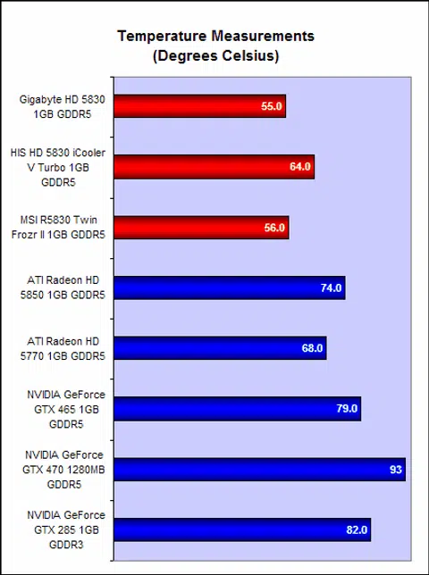 Our trio of Radeon HD 5830 cards all came with customized cooling solutions, so it was interesting to see which was most effective. The Gigabyte HD 5830 and MSI R5830 Twin Frozr II did the best in our temperature test, as both managed around 55 degrees Celsius. Since there's no reference version of the Radeon HD 5830 from ATI to act as a baseline, it's difficult to say how effective the coolers are. Nevertheless, 55 degrees Celsius is an ideal reading in our books. The HIS HD 5830 iCooler V Turbo recorded 64 degrees Celsius, which is substantially more than its competitors, but was somewhat expected due to its overclocked nature and its single fan design.