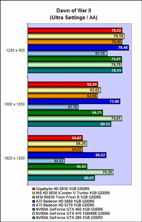 Our trio of Radeon HD 5830 cards started brightly on Dawn of War 2, coming close to the performance of the more powerful and costly Radeon HD 5850. However, its performance dipped significantly as we increased the resolution. At 1280 x 800, it was only about 5% slower, but at 1920 x 1200, the difference increased to almost 20%. However, it was able to keep pace with the GeForce GTX 465.