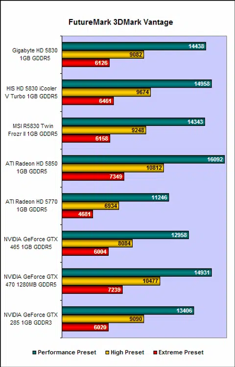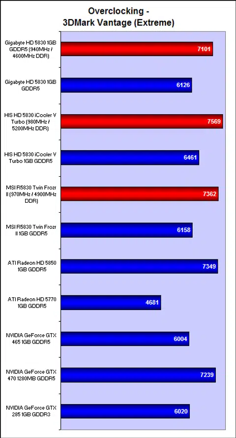 What impressed us about the Radeon HD 5830 was its overclocking abilities. With a stock clock of 800MHz at the core, it was amazing that all three cards managed to go well beyond 900MHz. The HIS HD 5830 iCooler V Turbo was our top performer here, managing as astonishing 980MHz at the core and 52000MHz DDR at the memory. This allowed it to score 7569 3DMarks on the Extreme preset, which surpasses even the Radeon HD 5850.