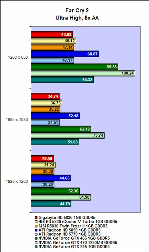 The Radeon HD 5830 continues to perform in between the Radeon HD 5850 and HD 5770, but we noticed that its performance dipped quite a bit when 8x anti-aliasing was enabled. With 8x anti-aliasing enabled, its performance was only about on a par with the Radeon HD 5770. The cut in the number of ROP units seem to be the cause for this.