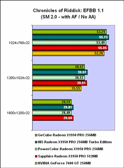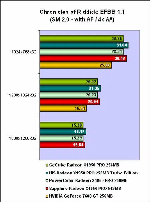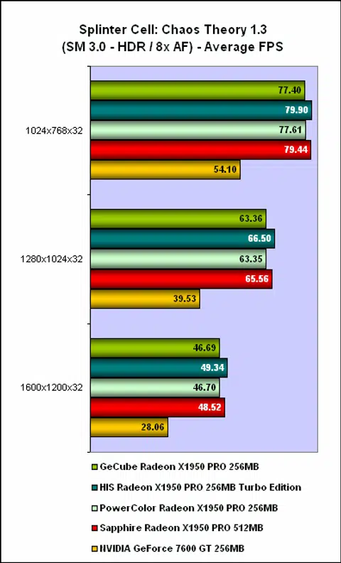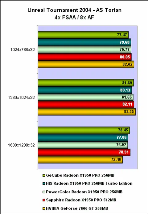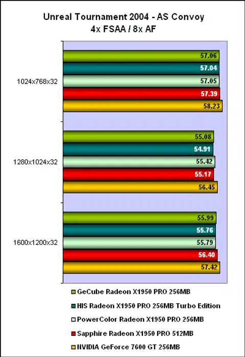 The Sapphire and HIS again proved to be the front-runners in Splinter Cell, with the HIS having the slightest of numerical advantage. A minor gap of up to two frames per second in Splinter Cell and even less than that in Unreal Tournament is hardly the most decisive of differences however and one could argue that it's a result that favors the least expensive card. It was also interesting to find that the GeForce 7600 GT held its own in Unreal Tournament 2004 against the Radeon X1950 PRO.