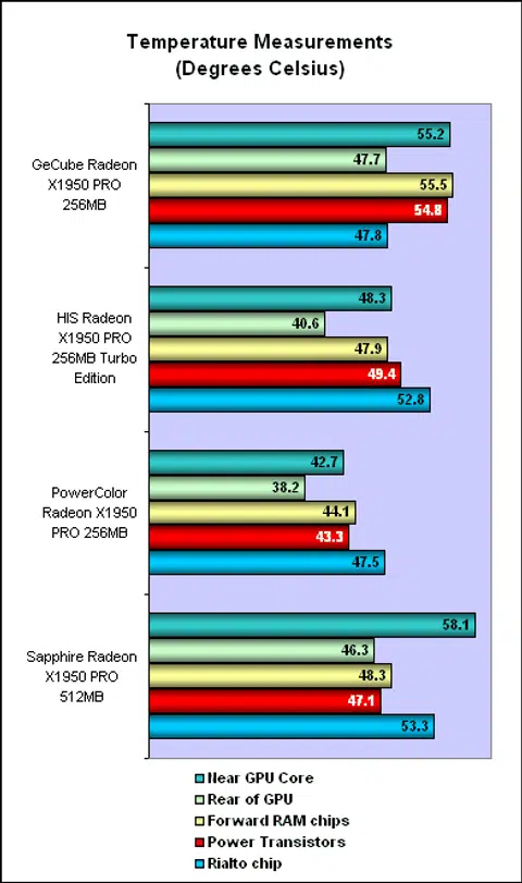 The two-slot coolers proved their worth here, with the PowerColor's Accelero X2 excelling together with HIS' IceQ 3 cooler. With average temperatures comfortably below 50 degrees Celsisus, both the HIS and PowerColor have the edge over the others in terms of both heat and noise output. The GeCube was the most disappointing as despite the copper base, it was both noisy and none too cool. Overall, we were quite surprised at the relatively cool temperatures on all cards, as even the temperatures found on Rialto chip were a significant improvement over older AGP cards from ATI.
