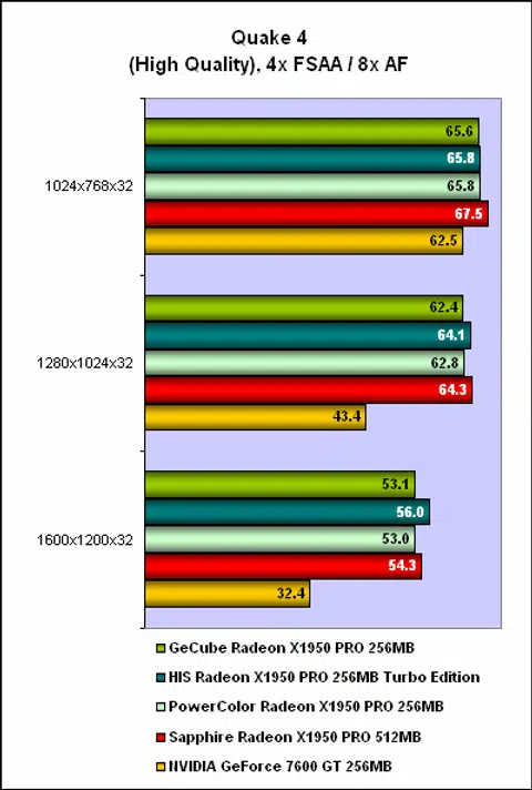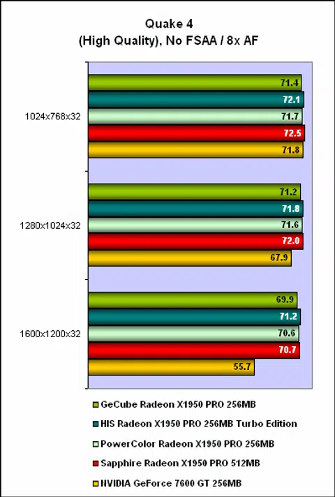 The performance gap between the various Radeon X1950 PRO models were again quite minor and as usual, the HIS and Sapphire were jousting for top spot. This was especially prominent in Quake 4 where we had very similar scores until the more taxing resolutions and settings. Even then, the differences were not of a magnitude where they could be easily spotted by end users.